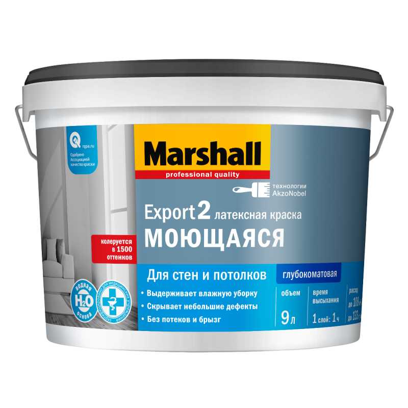Краска MARSHALL Export-2 латексная глубокомат.белая BW - глубокоматовая латексная краска для стен и потолков*Абсолютно матовое и гладкое покрытие*Выдерживает влажную уборку*Тиксотропная формула: без брызг и потеков*Обладает отличной укрывистостьюОПИСАНИЕГлубокоматовая водно-дисперсионная (латексная) краска для стен и потолков. Обладает высокой адгезией, продлевая срок службы окрашенной поверхности. Скрывает небольшие дефекты поверхности. Продукт удобен в применении. Отличается высокой укрывистостью, что позволяет сократить расход лакокрасочного материала. Краска быстро высыхает. Не имеет резкого запаха.ОБЛАСТЬ ПРИМЕНЕНИЯДля внутренних работ. Подходит для нанесения на полностью просохшие минеральные поверхности (бетон, штукатурка, кирпич и т. п.), гипсокартон, обои под покраску. Рекомендуется для окрашивания помещений с умеренной влажностью, таких как спальня, гостиная, кабинет, кладовка, гардеробная и т. п. Сертифицирована в РФ для применения в детских и лечебно-профилактических учреждениях.ОСОБЕННОСТИ ПРИМЕНЕНИЯПеред применением тщательно перемешать. Произвести подготовку поверхности. Рекомендуется наносить в два слоя при температуре от +5°C до +30°С, относительной влажности воздуха <80%. Для укрепления базовой поверхности и повышения адгезии слабо связанные или пористые поверхности обработать грунтовкой глубокого проникновения Export Base.ТЕХНИЧЕСКИЕ ДАННЫЕСвязующее: стирол-акриловая дисперсияРазбавитель: водаРабочие инструменты: кисть, валик, распылительСухой остаток (масс): 55%Плотность: 1,46 кг/лВремя до нанесения финишного покрытия: 1 чаcВремя полного высыхания покрытия: 2-4 часаРасход (в 1 слой): до 12 м2/лБазы: BW, BCСистема колеровки: AcomixСрок и условия хранения: 2 года при t° от +5°С до +30°С вдали от источников излучения, нагревательныхи осветительных приборовУход за окрашенной поверхностью: отдельные загрязнения можно протирать влажной тряпкой без применения моющих средств, не оставлять поверхность мокрой после очистки