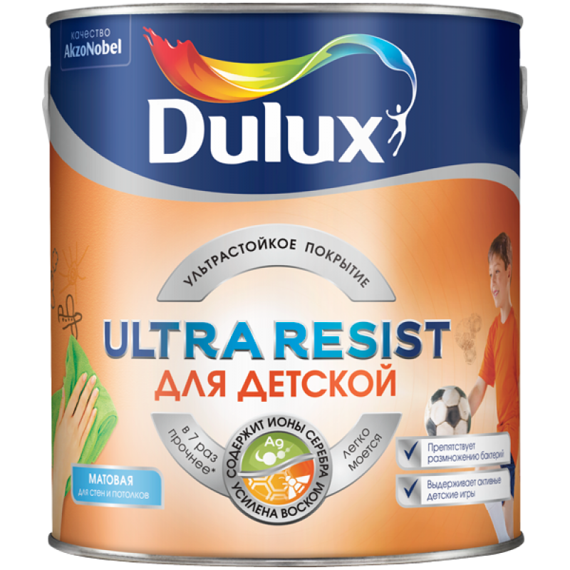 Dulux Ultra Resist Для детской МАТОВАЯРасход < 12 m²/L Время высыхания 4-6 часов Количество слоев: 2 слояДля внутренних работ. Подходит для нанесения на полностью просохшие минеральные поверхности (бетон, штукатурка, кирпич и т. п.), гипсокартон, обои под покраску, ДВП, ДСП. Рекомендуется для окрашивания помещений с умеренной влажностью, таких как детские, спальни, игровые комнаты, помещения в детских учреждениях, а также гостиные, кабинеты, библиотеки и т. п. Сертифицирована для применения в детских и лечебно-профилактических учреждениях.Особые характеристикиУЛУЧШЕННЫЕ ГРЯЗЕ- И ВОДООТТАЛКИВАЮЩИЕ СВОЙСТВАУСТОЙЧИВА К МЫТЬЮВЫДЕРЖИВАЕТ АКТИВНЫЕ ДЕТСКИЕ ИГРЫСОДЕРЖИТ ИОНЫ СЕРЕБРА, ПРЕПЯТСТВУЮЩИЕ РАЗМНОЖЕНИЮ БАКТЕРИЙСОДЕРЖИТ ВОСКНЕ СОДЕРЖИТ ЛЕТУЧИХ ОРГАНИЧЕСКИХ ВЕЩЕСТВСведения об использованииПодготовка поверхности: Поверхность должна быть сухой и чистой. Перед окраской минеральной поверхности, ДСП, ДВП и гипсокартона очистите их от пыли, грязи, отслаивающихся частей старого покрытия. Дефекты зашпатлюйте. Ранее окрашенные и зашпатлеванные поверхности ошлифуйте. Чтобы уменьшить расход краски, загрунтуйте подготовленную поверхность грунтовкой Dulux BINDO BASE. Окрашивая обои, убедитесь, что на поверхности не осталось клея. Чтобы обои не отстали, наносите краску не ранее 24 ч после оклейки.Покраска: Перед применением тщательно перемешайте. Наносите в два слоя при температуре воздуха и поверхности от +5 °С до +30 °С. Произвести подготовку поверхности с помощью универсальной грунтовки глубокого проникновения Dulux Bindo Base.Используйте кисть с синтетическим ворсом, валик для водно-дисперсионных интерьерных красок или распылитель. Второй слой наносите через 4 часа после первого. При окраске деревянных поверхностей рекомендуется нанести специальное грунтовочное покрытие. Количество на поддоне:7,27, 6,53, 5,86л - 100 шт; 2,5, 2,4, 2,25л - 165шт