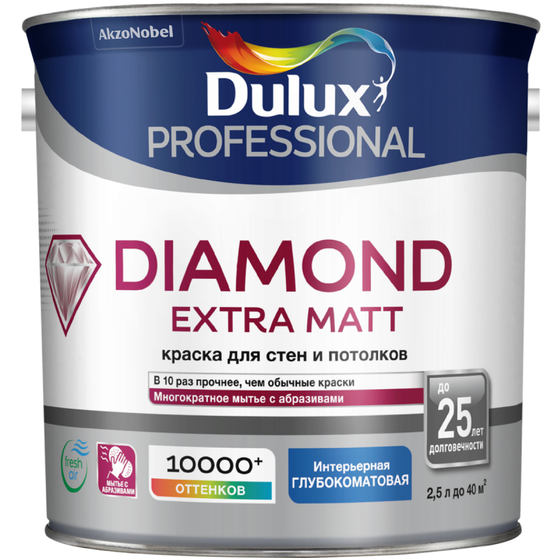 Краска DULUX TRADE Diamond Extra Matt белая BW, глубокомаматовая краска для стен и потолковОСОБЕННОСТИ, ПРЕИМУЩЕСТВАСовершенство глубокоматового покрытия подарит вашему дому уютную роскошь английского стиля и непревзойден- ную красоту.Зеленый знак Fresh Air гарантирует содержание летучих органических соединений в 3 и более раз ниже, чем европейские нормативы (Евродиректива 2004/42/EC).1.Особо гладкое покрытие2.Укрывистая и экологичная3.Гипоаллергенная*4.Маскирует небольшие дефекты поверхностиТЕХНИЧЕСКИЕ ДАННЫЕ1.Связующее: сополимерная дисперсия.2.Разбавитель: вода.3.Рабочие инструменты: кисть, валик, распылитель.4.Сухой остаток(масс): ≈ 61 %.5.Плотность: ≈1,41 кг/л.6.Время до нанесения следующего слоя: 2 часа.7.Время полного высыхания: 4 часа.8.Раcход: До 17 м2/л.9.Базы: BW, BC.10.Система колеровки: acomix.11.Срок и условия хранения: 4 года при температуре от +5 °С до +30 °С в невскрытой заводской упаковке.12.Уход за крашенной поверхностью: Избегайте мытья и интенсивной очистки свежеокрашенной поверхности. Через месяц после покраски можно протирать с помощью сухой мягкой щетки или тряпки для удаления пыли. Сильные загрязнения можно удалять влажной, смоченной врастворе мыла или шампуня, мягкой неворсистой тканью. Возможно небольшое изменение блеска покрытия. Не оставляйте поверхность мокрой.ОПИСАНИЕГлубокоматовая водно-дисперсионная краска для высококачественной отделки стен и потолков, максимально укрывистая, с нейтральным запахом. Создает идеально гладкое покрытие.В основе гладкости покрытия лежит мрамор тонкого помола, который выравнивает поверхность и придает великолепные декоративные свойства. Абсолютно матовое покрытие без бликов визуально скрывает небольшие дефекты поверхности.ОБЛАСТЬ ПРИМЕНЕНИЯДля окраски стен и потолков в помещениях с умеренной влажностью и умеренной эксплуатационной нагруз-кой, таких как спальни и гостиные. Наносите на полностью просохшие и гладкие минеральные поверхности (бетон, штукатурка, кирпич), гипсокартон, обои под покраску.Заявленные свойства краски зависят от выбранного типа обоев.Сертифицирована для применения в детских и лечебно-профилактических учреждениях.ОСОБЕННОСТИ ПРИМЕНЕНИЯПеред применением тщательно перемешайте. Для укрепления базовой поверхности, повышения адгезии и уменьшения расхода краски загрунтуйте подготовленную поверхность грунтовкой Dulux. Краску рекомендуется наносить в 2 слоя при температуре воздуха и поверхности+5…+30 °С и влажности воздуха от 40 до 80%.РАЗБАВЛЕНИЕПри необходимости не более 1 части воды на 10 частей краски.
