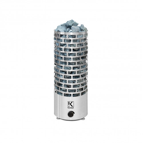 Электрокаменка Karina Nova 8 предназначена для использования в парных объемом до 12 м3. Печь выполнена в напольном варианте цилиндрической формы со встроенным на корпусе регулятором температуры. Напряжение питания печи – 220/380В. Печь укомплектована 3 ТЭНами, расположенными в виде треугольника. Внизу печи - бак для воды емкостью 3 л, который является парогенератором. Выше парогенератора расположена емкость под мелкие камни или нержавеющие шары объемом 2.5 л, вмещающая 5 кг мелкого камня, называемая закрытой каменкой с воронкой для подачи воды и получения мелкодисперсного пара. Электрическая печь Karina Nova 6 многофункциональна, и при правильной эксплуатации она подойдет для любителей как финской сауны, так и русской бани. Если в парогенератор не заливать воду, электропечь разогреет парную до высокой температуры (100 -120°C) с относительной влажностью воздуха 10-12% - режим сухой бани (финская сауна). Если залить воду в парогенератор, то при разогреве парной вода будет испаряться и увлажнять воздух до режима русской бани (60-70°C и 40-50% влажности). Но в обоих случаях возможно использование закрытой каменки которая дополнительно прибавит вам мелкодисперного необжигающего пара, от которого вы получите удовольствие, находясь в парном помещении. Когда электрическая печь Karina Nova 6 выходит на заданную ей температуру, она полностью не отключается, а работает на постоянной основе на 50% от мощности для того, чтобы камни в печи всегда были горячие и давали пар, в отличии от любых аналогов, у которых печь отключается целиком, и камни быстро остывают. При понижении температуры в парной на 2-3 градуса от заданной, вторые 50% мощности подключатся, и каменка будет работать в полную мощность. Все корпусные элементы выполнены из нержавеющей стали. Вес загружаемых камней в печь составляет 100кг, что сопоставимо с загрузкой камней в хорошей дровяной печи. Нагревательный элемент - ТЭН диаметром 10мм. В итоге с помощью парогенератора, закрытой каменки и большой закладки камня, легко достигается режим настоящей русской бани.