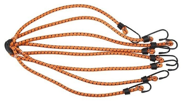 Паук багажный имеет надежную и удобную конструкцию, четыре резиновых жгута, перехваченных в середине кольцом, оснащены на концах крюками, надежно зацепляющимися за багажник.