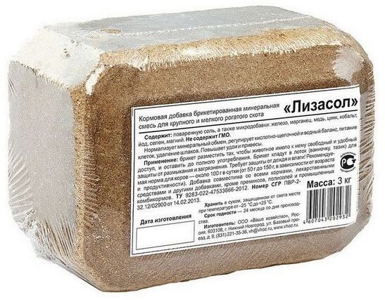 брикет разместить так, чтобы животное имело к нему свободный и удобный доступ, и оставить до полного употребления. Брикет кладут в лоток (ванночку, тазик) для защиты от размокания и загрязнения. Требует защиты от дождя и влаги!