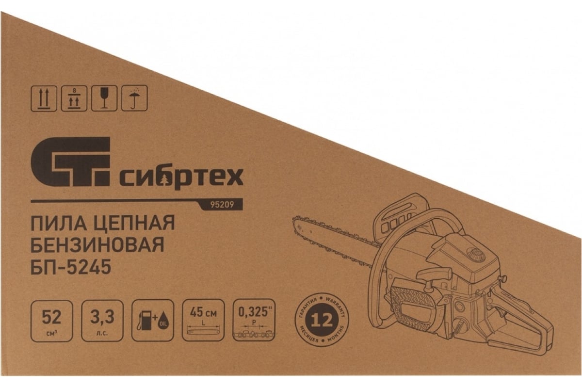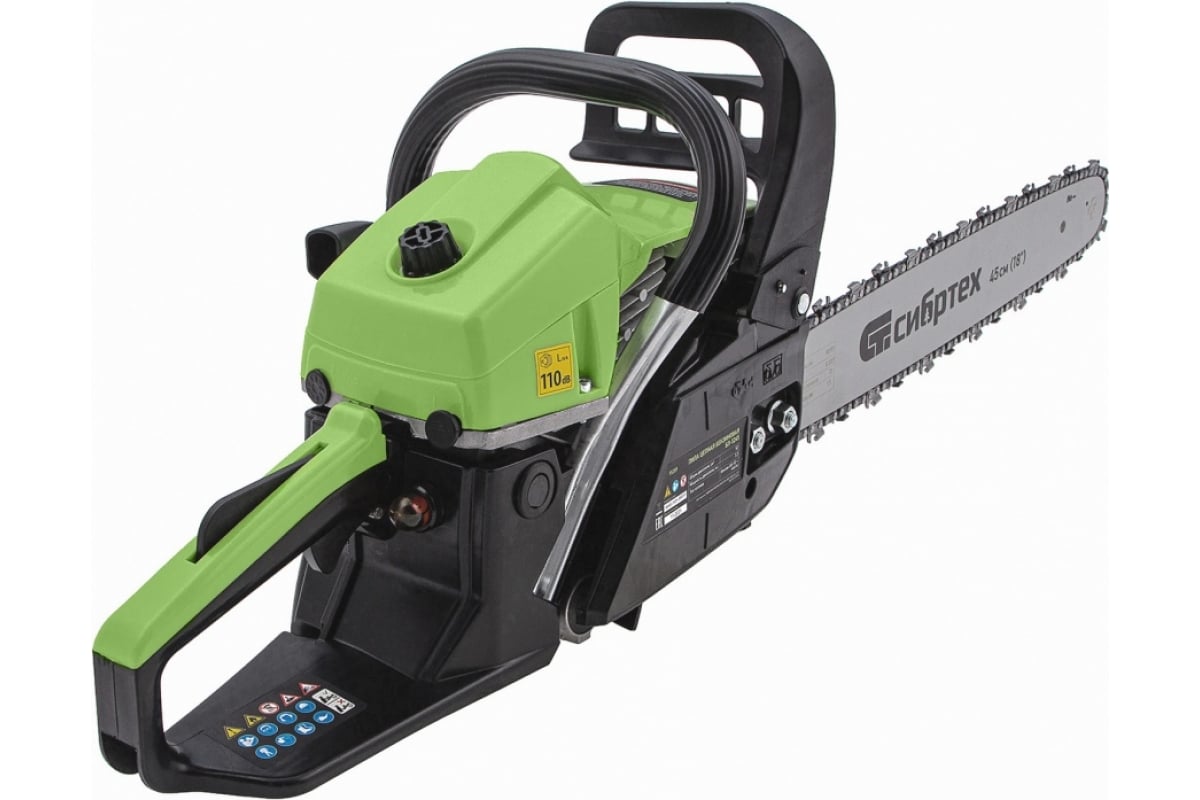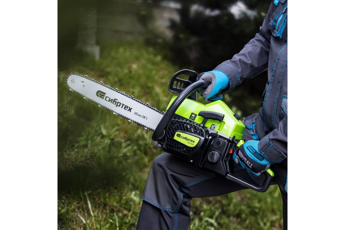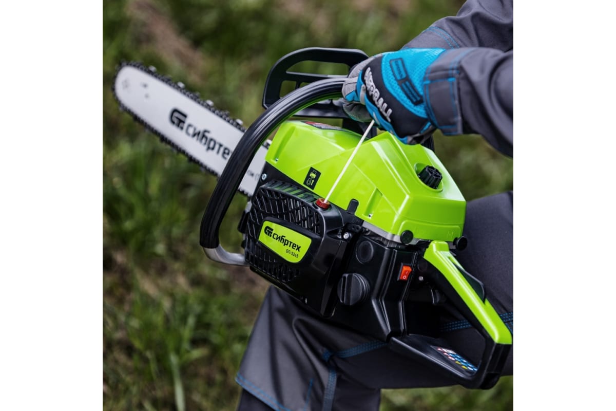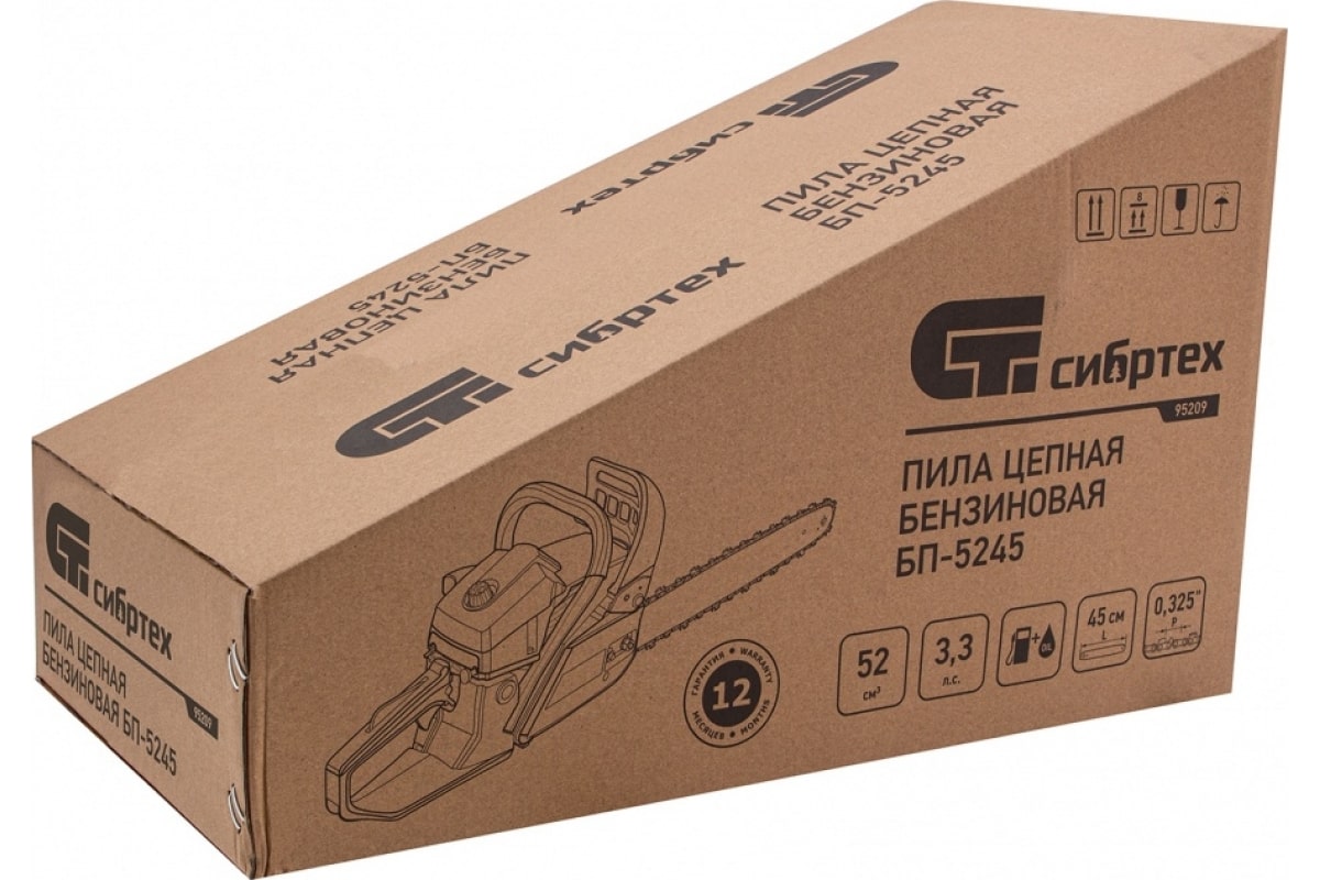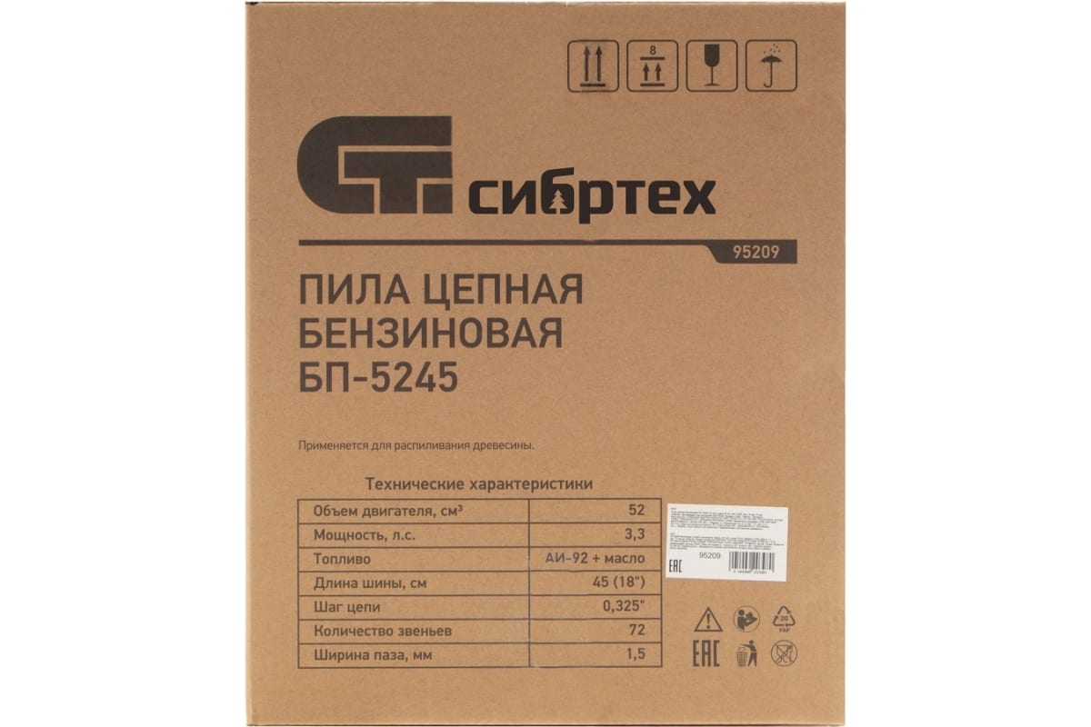Цепная бензиновая пила СИБРТЕХ БП-5245 95209 с двухтактным двигателем объемом 52 см3 и мощностью 3.3 л.с предназначена для распиловки древесины различных пород, заготовки дров, спиливания веток и крупных сучков. Пригодится во время ремонта, строительства, благоустройства садового участка и при выполнении бытовых задач.