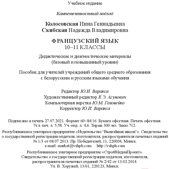 Учебное пособие Вышэйшая школа Французский язык. 10-11 классы. Дидакт. и диагн. материалы (Колосовская И.)
