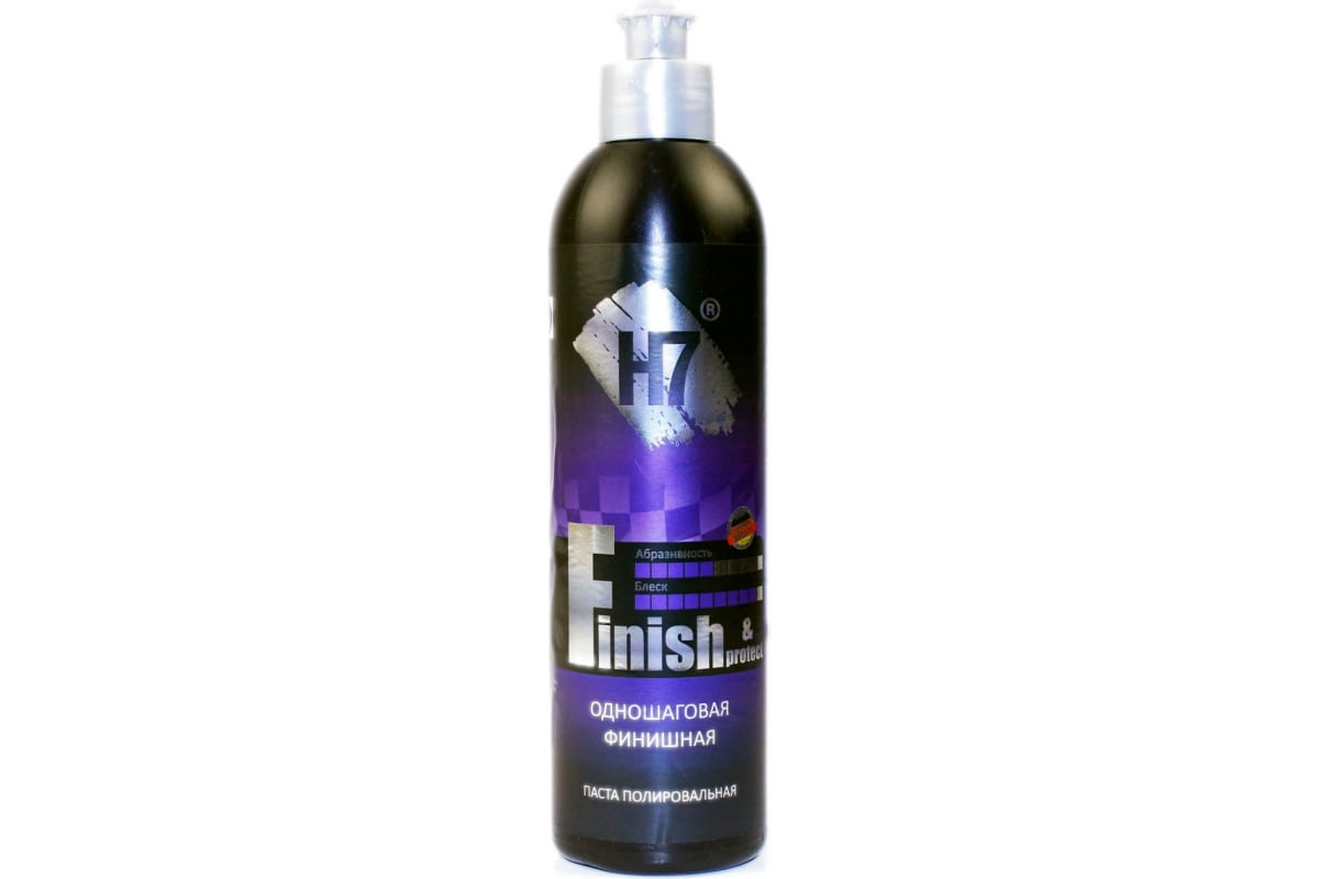 Паста полировальная одношаговая мелкоабразивная Finish & Protect 0.25 л H7 891522 - паста, которая работает, начиная со второго шага полировки и до финишного состояния. Идеально подойдет как для работы профессионалов детейлинга, так и для начинающих пользователей. Легко и быстро восстанавливает блеск подержанных автомобилей, не имеющих глубоких дефектов на ЛКП. В сочетании с полировальником средней жесткости паста быстро и эффективно удаляет следы работы полировальных паст первого шага полировки. Способна удалять следы от стандартной эксплуатации и мойки автомобиля или шлифовки абразивом с зерном Р3000 в сочетании с жестким поролоновым полировальником. На третьем шаге полировки она работает в сочетании с мягким полировальником и доводит обрабатываемую поверхность до глубокого блеска, сравнимого с результатом работы антиголограммных финишных паст.