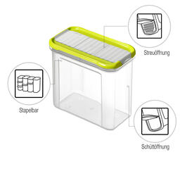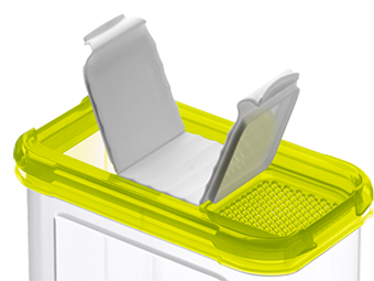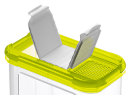 Корпус контейнера для сыпучих продуктов Domino прозрачен и позволяет видеть как содержимое, так и его количество. Гибкая крышка герметично закрывает банку, так что в нее не могут просочиться ни кухонные ароматы,ни насекомые. В крышке находятся две плотно закрывающиеся заслонки с различными отверстиями. Они служат для простоты высыпания и дозирования, не снимая саму крышку. Благодаря специальной форме крышки можно надежно складывать все коробки для хранения сыпучих продуктов Domino друг на друга, а благодаря прямоугольной форме Вы можете хранить до 25% больше продуктов при равном потреблении места по сравнению с круглыми контейнерами. Изготовлено из высококачественного пищевого РР-пластика. Швейцарское качество бренда.