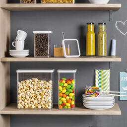 Прозрачные стенки банки LOFT от Rotho позволяют просматривать содержимое. Рис, крупы и макароны, мюсли и сухарики в емкости для хранения продуктов LOFT, будут защищены от посторонних запахов, жучков, моли и прочей живности. Колбасы или сыры можно хранить в емкостях LOFT и в холодильнике и в морозилке. Произведенную из устойчивого к царапанию PP-пластика банку для запасов LOFT можно мыть в посудомоечной машине. Эта серия продуктов Rotho, геометрически выверенной формы, позволяет ставить емкости друг на друга и прекрасно подходит для организованного хранения. Швейцарское качество.