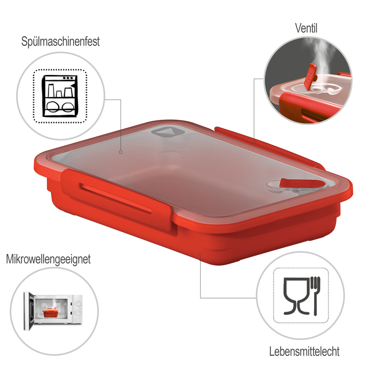 Блюда в микроволновке готовятся за считанные минуты. Вы с первого взгляда узнаете подходящую крышку к банке. Обе части - отдельно друг от друга - штабелируются в кухонном шкафу. Всего двумя щелчками крышка садится на контейнер и закрывает его.