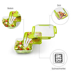 Различные коробки (ланч-бокс, меню-бокс или салат-бокс) разделены таким образом, чтобы различные продукты можно было хранить и транспортировать оптимальным образом. Столь же практичны столовые приборы, входящие в комплект . Ланч-бокс можно мыть в посудомоечной машине. Как и все продукты Rotho, этот ящик также не содержит загрязняющих веществ и BPA. Таким образом, вы сможете безопасно и стильно перевезти еду в офис или на пикник в будущем.