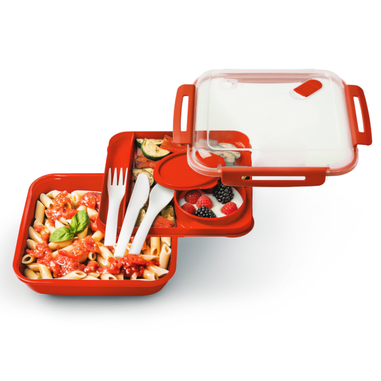 Коробка разделена таким образом, что вы можете, например, хранить хлеб и фрукты или овощи отдельно друг от друга. Столь же практичны столовые приборы, входящие в комплект поставки. Таким образом, вы можете съесть все, что упаковали в любом месте.