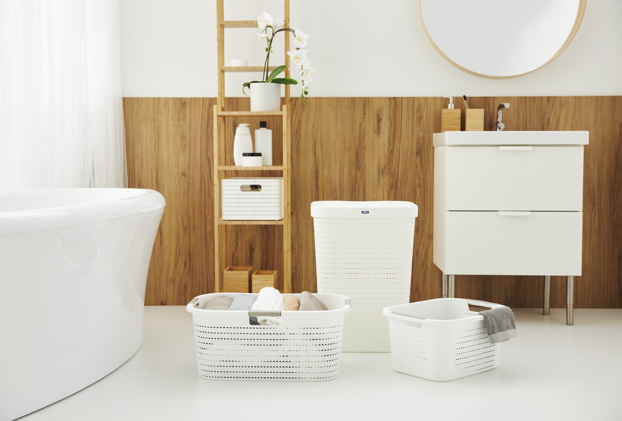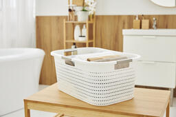Корзина для белья держится даже при полной загрузке мокрым бельем. Три мягкие и удобные ручки для переноски, а также эргономичная форма корзины позволяют удобно переносить разные виды, например, только одной рукой.