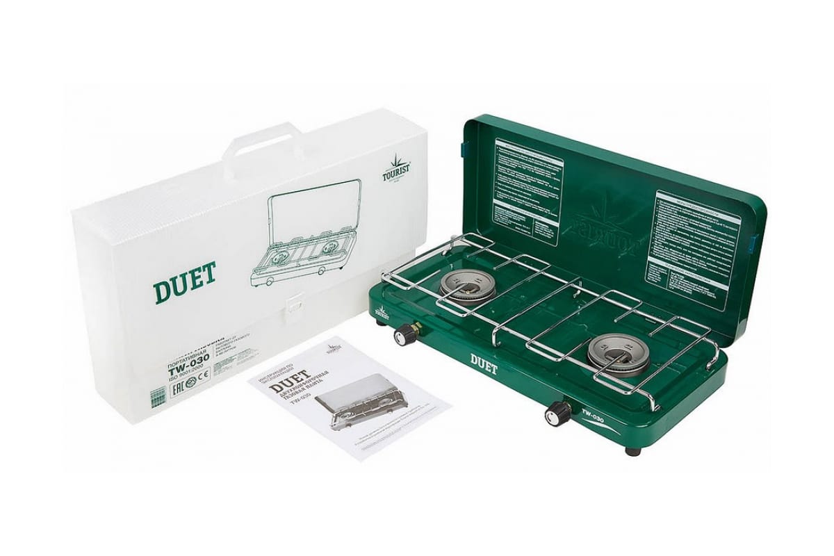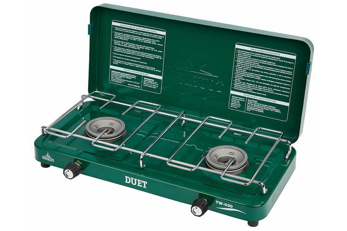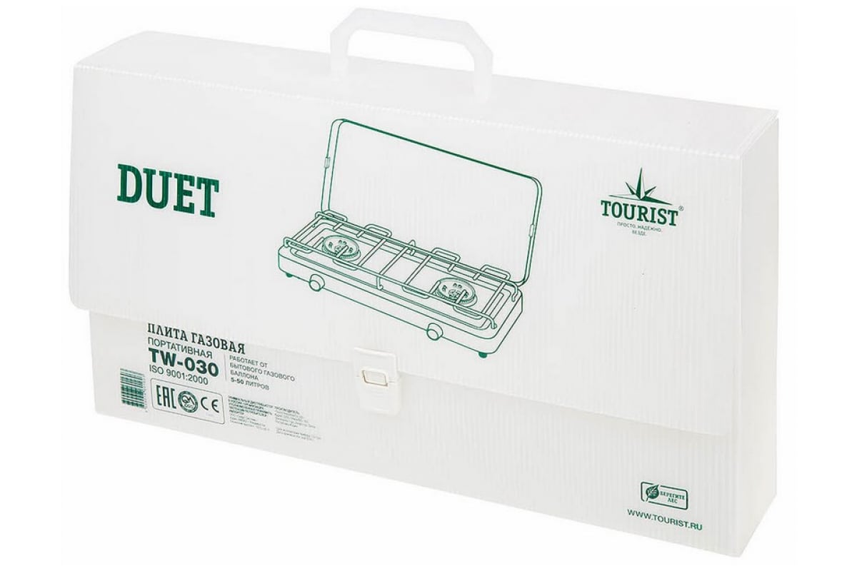Газовая портативная плита TOURIST DUET 0071478 - компактная двухконфорочная газовая плита в кейсе. Имеет удобную откидную крышку защищающую рабочую поверхность от ветра и загрязнения. Работает только от бытовых газ баллонов 5, 12, 27, 50 л.