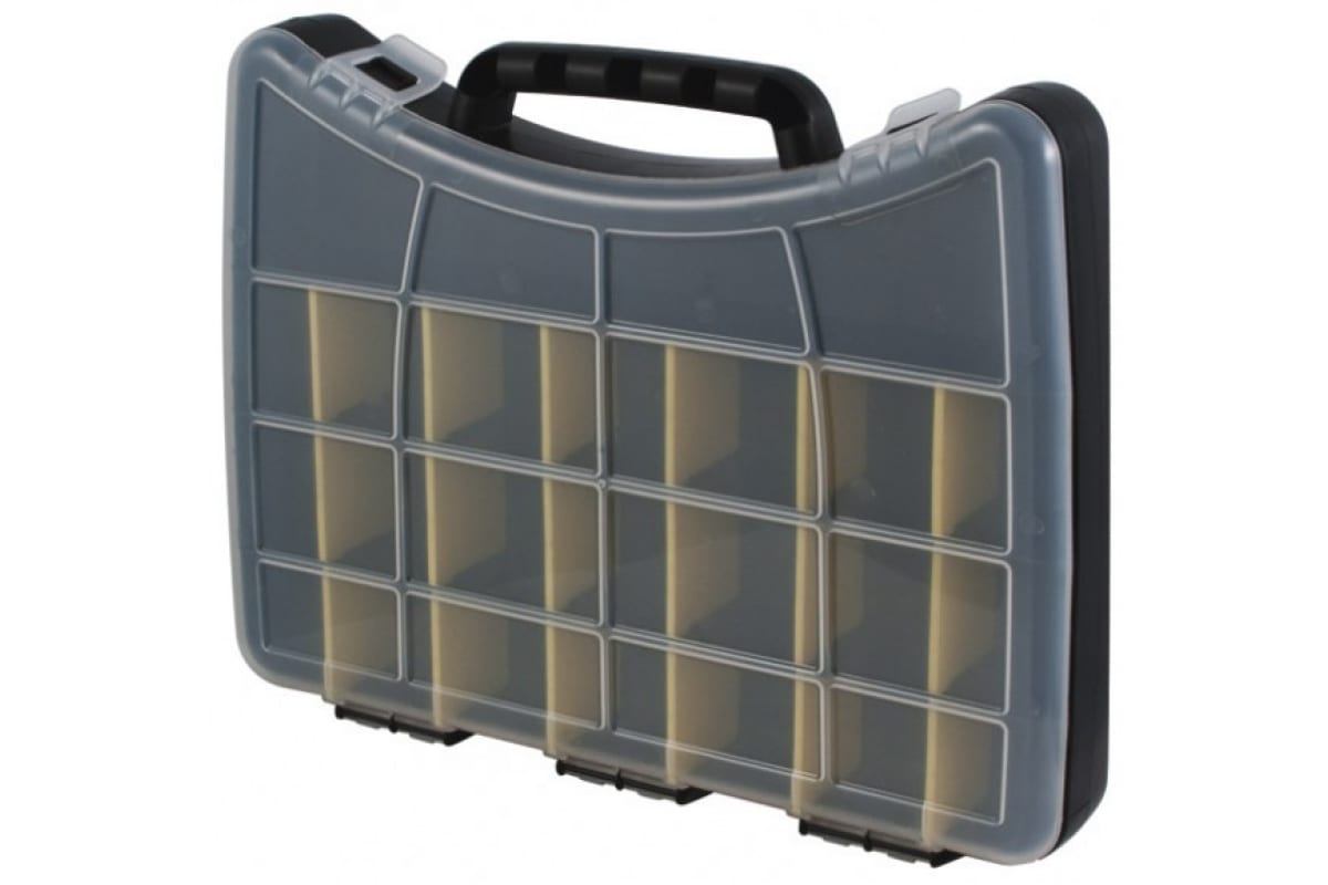 Пластиковый ящик FIT 65653 выполнен в форме кейса, служит для хранения и переноски крепежных изделий. Состоит из 22 отделений, где удобно размещаются необходимые аксессуары и различные мелочи. С помощью переставных перегородок можно регулировать размеры ячеек, чтобы максимально эффективно использовать имеющееся внутри пространство. Прозрачная крышка позволяет видеть расположение крепежа внутри. Две пластиковые защелки надежно защищают чемоданчик от непреднамеренного открывания.