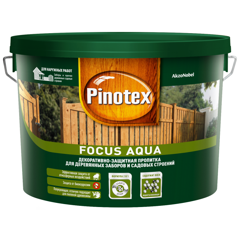 PINOTEX FOCUS AQUA (ПИНОТЕКС ФОКУС АКВА) – декоративно-защитная пропитка для деревянных заборов и садовых строенийОПИСАНИЕПолукроющая декоративно-защитная пропитка для заборов и садовых построек, изготовленных из пиленой древесины. Благодаря высокому содержанию атмосферостойких пигментов эффективно защищает деревянную поверхность от ультрафиолетового излучения. Применение воска в составе обеспечивает дополнительный водоотталкивающий эффект поверхности. Содержит эффективные антисептики для защиты древесины от плесени и водорослей. Подходит для разных пород древесины. Не стекает с инструмента и поверхности при нанесении.ОБЛАСТЬ ПРИМЕНЕНИЯДля наружных работ. Подходит для окраски конструкций из пиленой древесины, например заборов, ворот, калиток, небольших оград и садовых строений. Не рекомендуется использовать в жилых помещениях.УНИКАЛЬНЫЕ КОМПОНЕНТЫ: добавки против грибка и водорослей, воскСВЯЗУЮЩЕЕ: алкидная смолаРАСТВОРИТЕЛЬ: водаВРЕМЯ ДО НАНЕСЕНИЯ СЛЕДУЮЩЕГО СЛОЯ: 8 часовВРЕМЯ ПОЛНОГО ВЫСЫХАНИЯ: 12 ЧАСАРАСХОД НА ОДИН СЛОЙ: пиленая древесина 8-12 м²/лГОТОВЫЕ ЦВЕТА: рябина, красное дерево, палисандр, орех, золотая осень, зеленый лесРАБОЧИЕ ИНСТРУМЕНТЫ: кисть со смешанным ворсомРАЗБАВЛЕНИЕРазбавление не требуетсяОСОБЕННОСТИ ПРИМЕНЕНИЯПеред применением и в процессе работы тщательно перемешивать. Произвести подготовку поверхности (отшлифуйте, затем уберите пыль неворсистой тканью). В случае, если на поверхности заметны гниль, смола или смоляные карманы, пятна ржави, дубильные вещества тщательно отшлифуйте поверхность, обработайте блокирующем грунтом или антисептиком. Рекомендуется наносить в 2-3 слоя кистью со смешанным ворсом по направлению волокон древесины при температуре не ниже +10 С° и не выше+25 С°, относительной влажности воздуха до 80%, влажности древесины <18%.Особо тщательно пропитывать торцевые поверхности обрабатываемой древесины.ВНИМАНИЕ! При понижении температуры и увеличении относительной влажности воздуха время высыхания может увеличиться. Если поверхность находится под интенсивным воздействием солнечных лучей, рекомендуется наносить пропитку в 3 слоя. Эксплуатацию окрашенной поверхности начинайте не ранее, чем через 14 дней после окрашивания.