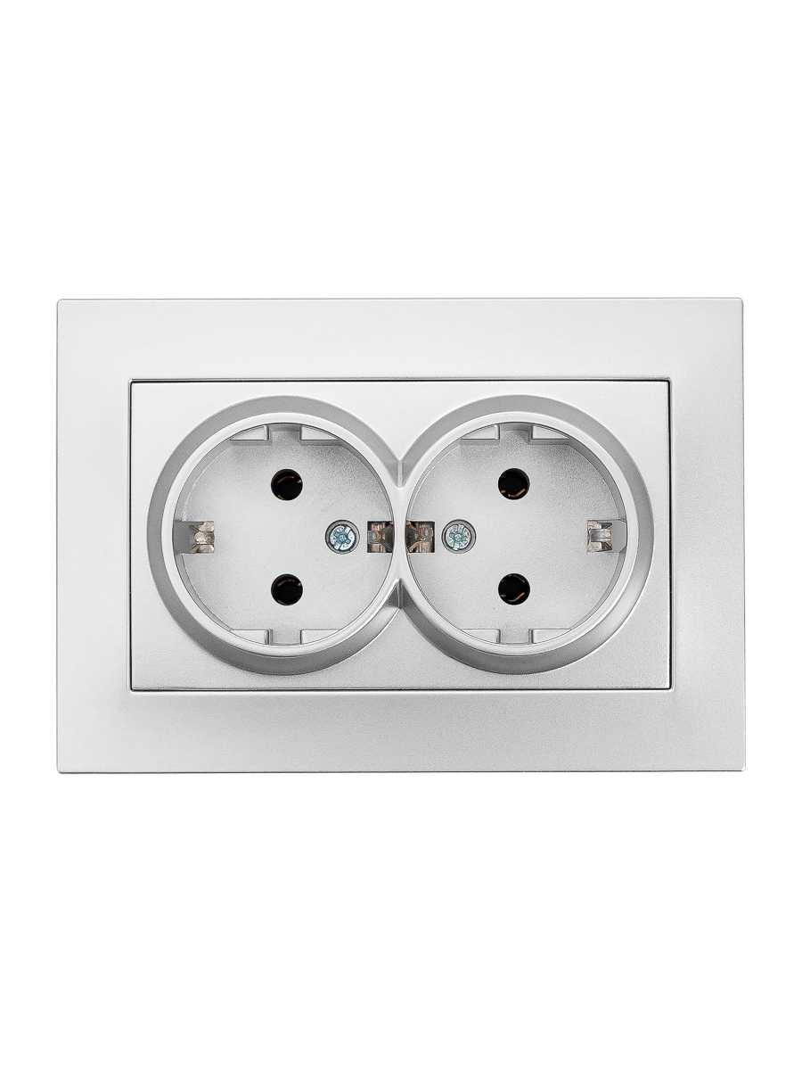 Узел розетки 2-гнездной, с заземлением, без шторок, для скрытой установки. С рамкой. Цвет - серебро.