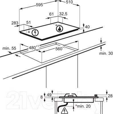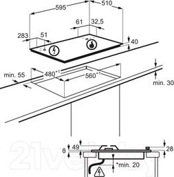 • Подробная информация о конфорках 1 x 52 мм, 2.75 кВт 1 x 35 мм, 1.85 кВт 1 x 35 мм, 1.85 кВт 1 x 28 мм, 1 кВт