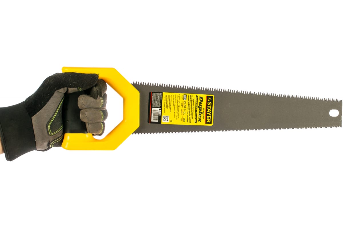 Ножовка двухсторонняя, 350мм STAYER HI-TEFLON 2-15089 используется для распила как малых, так и больших заготовок из разных пород дерева. Полотно выполнено из стали с тефлоновым покрытием, которое продлевает срок службы инструмента. С одной стороны все зубья данной ножовки прямые и закаленные с двухсторонней заточкой для поперечного распила, а с другой стороны зубья с трехгранной заточкой для поперечного и продольного распила. Эргономичная двухкомпонентная рукоять изготовлена из пластика с резиновыми вставками, что исключает скольжение в руке.