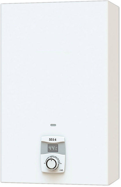 Водонагреватель проточный, газовый нагрев, производительность 14 л/мин, вертикальная установка, подводка нижняя.