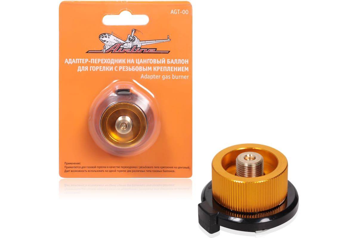 Адаптер-переходник AIRLINE на цанговый баллон для горелки с резьбовым креплением AGT-00 применяется в качестве переходника к газовой горелке с цанговым креплением для совместимости с газовым баллоном, имеющим резьбовой тип соединения.