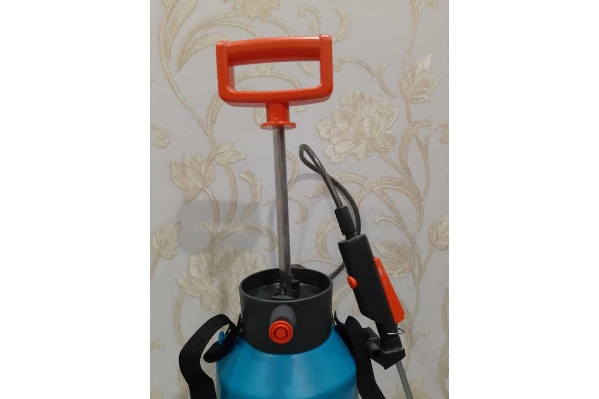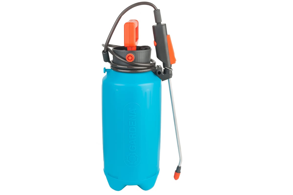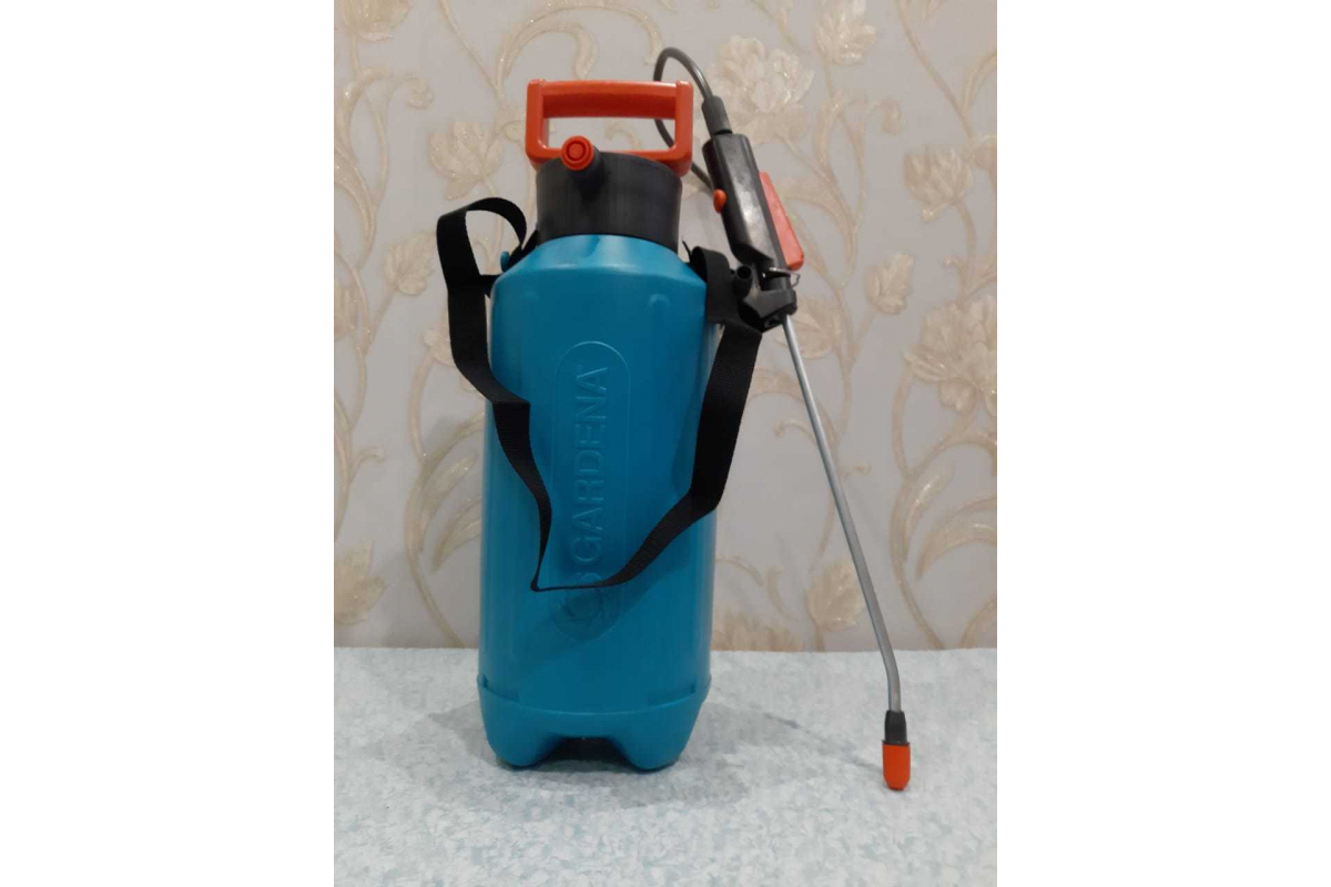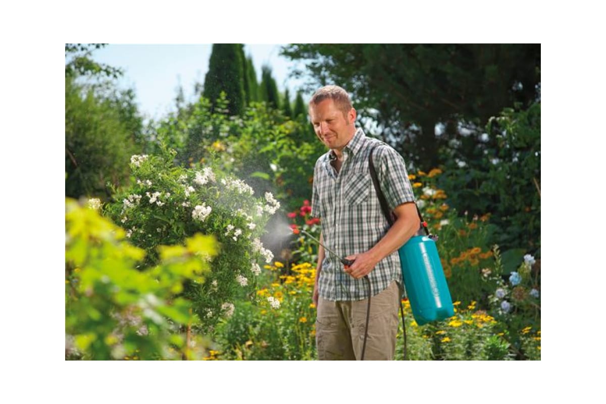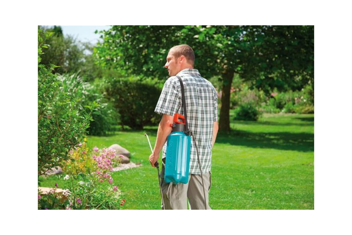 Опрыскиватель Gardena 5 л 00823-20.000.00 - пластиковый резервуар объёмом 5 литров с пневматическим насосом, вмонтированным в крышку, используемый для распыления жидкостей и полива растений. Закачка воздуха производится путем перемещения ручки вверх и вниз. Для подачи жидкости необходимо нажать на рычаг, расположенный на рукоятке. Опрыскиватель снабжен ремнем, который позволяет переносить его на плече.
