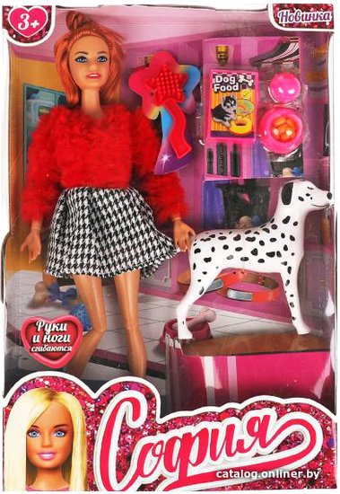 - Комплектация - София и собака породы далматин- расчёска- набор аксессуаров для ухода за домашним животным
