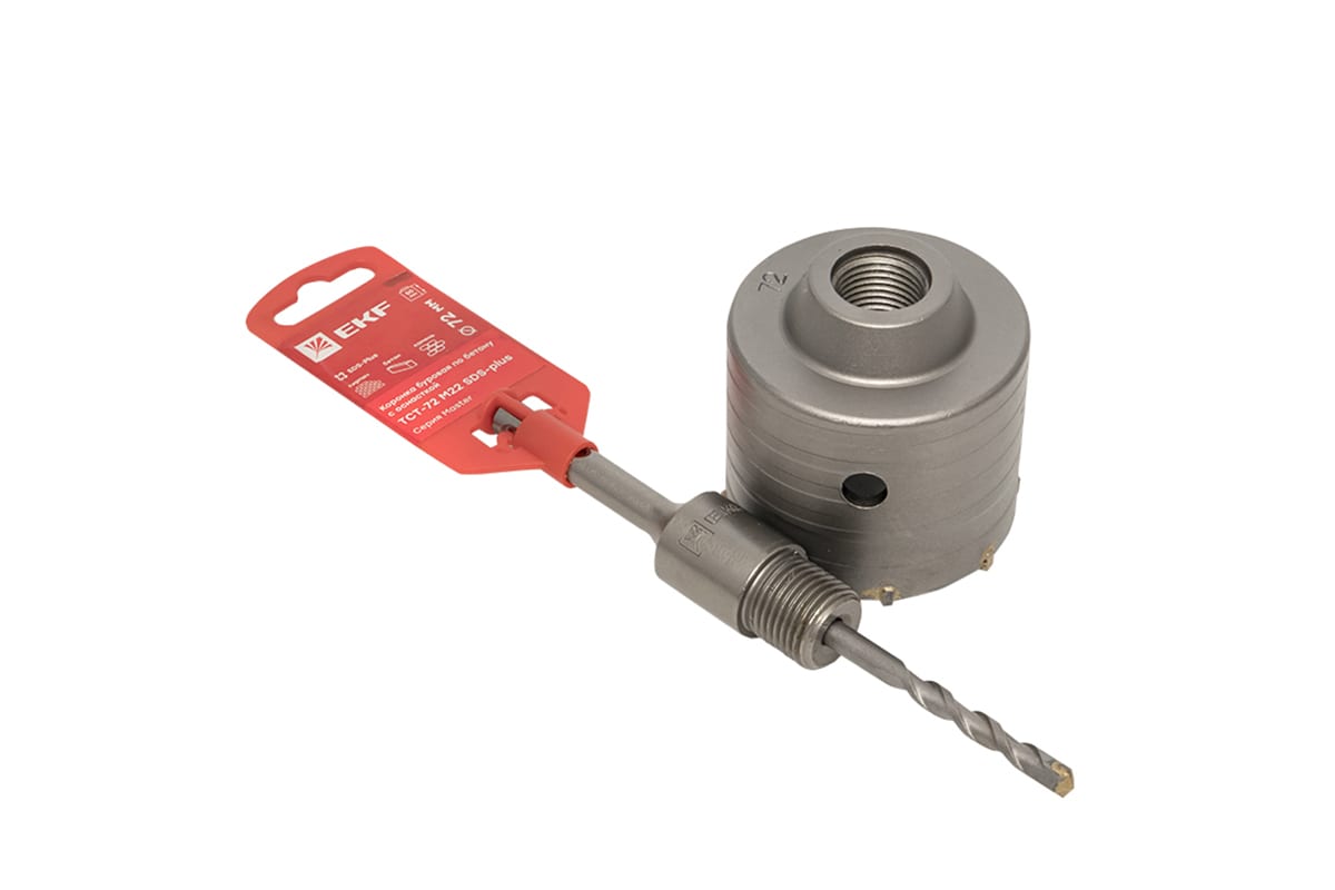 Коронка буровая по бетону с оснасткой Master TCT-72 (72 мм; М22; SDS-plus) EKF tct-72-m22 предназначена для быстрого и экономичного выполнения работ по разделке отверстий в бетоне, кирпиче, пенобетоне, известняке с помощью перфоратора в ударном режиме.