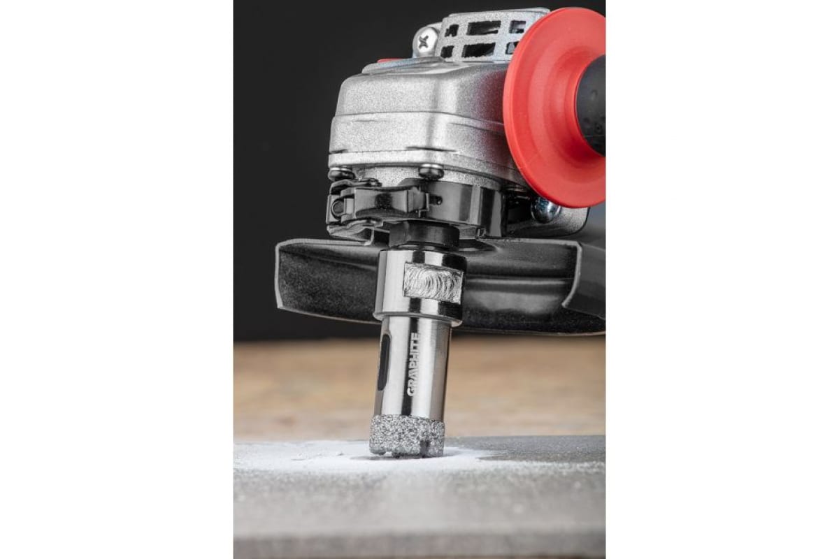 Сверло корончатое GRAPHITE 55H306 используется с угловыми шлифовальными машинами, к которым крепится при помощи резьбы М14. Применяется для работы по камню, керамограниту, плитке, асфальту, кирпичу и бетону.Покрытие - чернение + никелирование, обладающее антикоррозийными свойствами.Изготовлено по технологии вакуумной пайки, что обеспечивает высокую скорость сверления и увеличенный срок службы. Боковые отверстия гарантируют оптимальное охлаждение и удаление пыли во время работы. Предназначено для сухого сверления.Внимание, изображение товара может отличаться от реального! Верные параметры указаны в технических характеристиках товара.