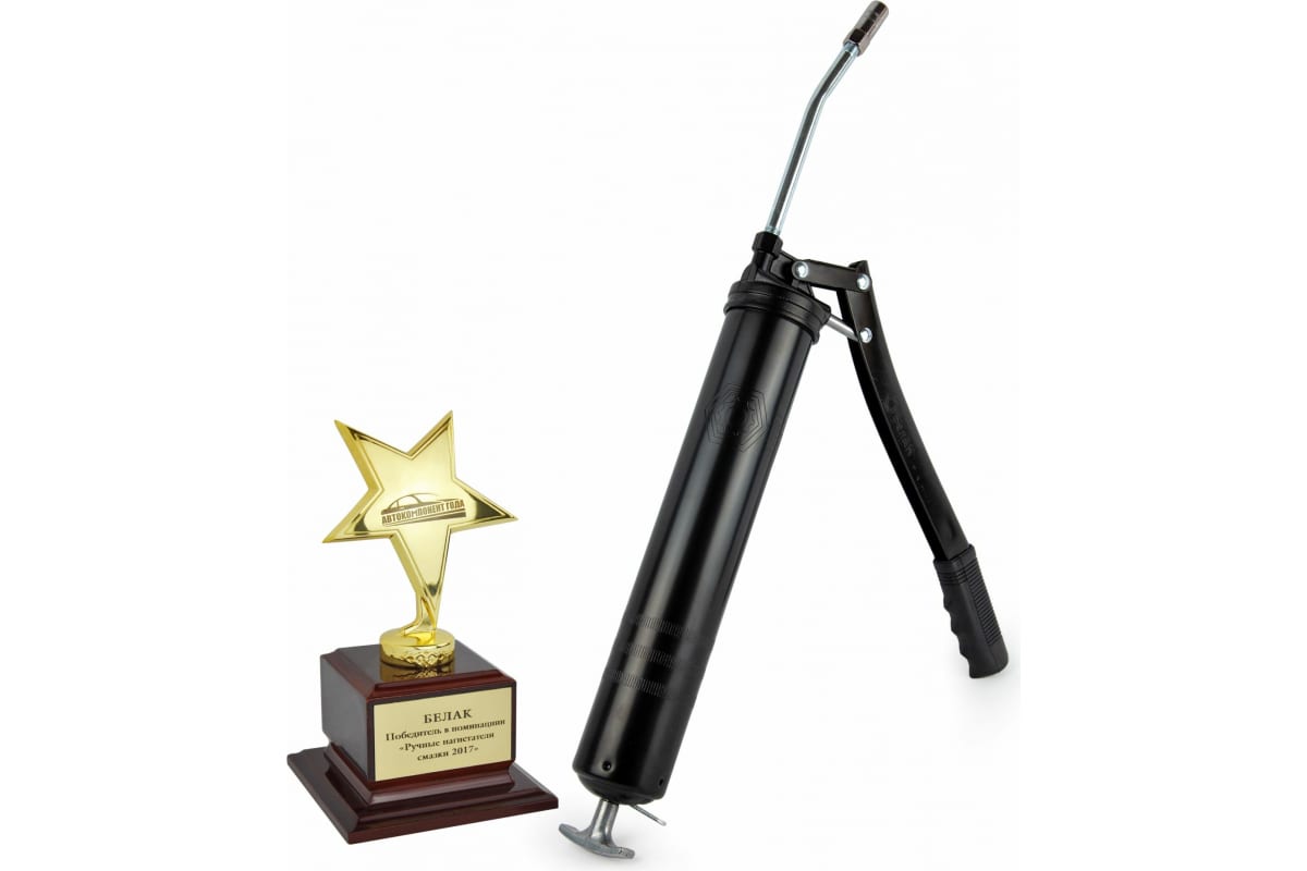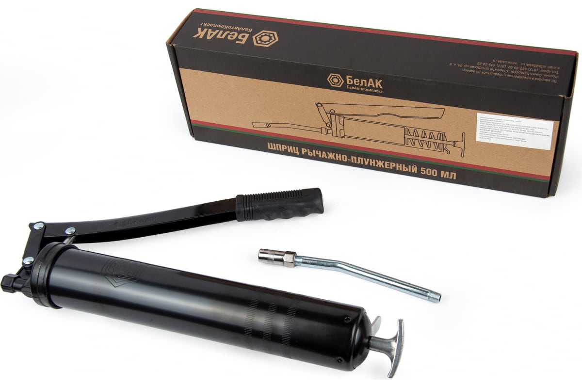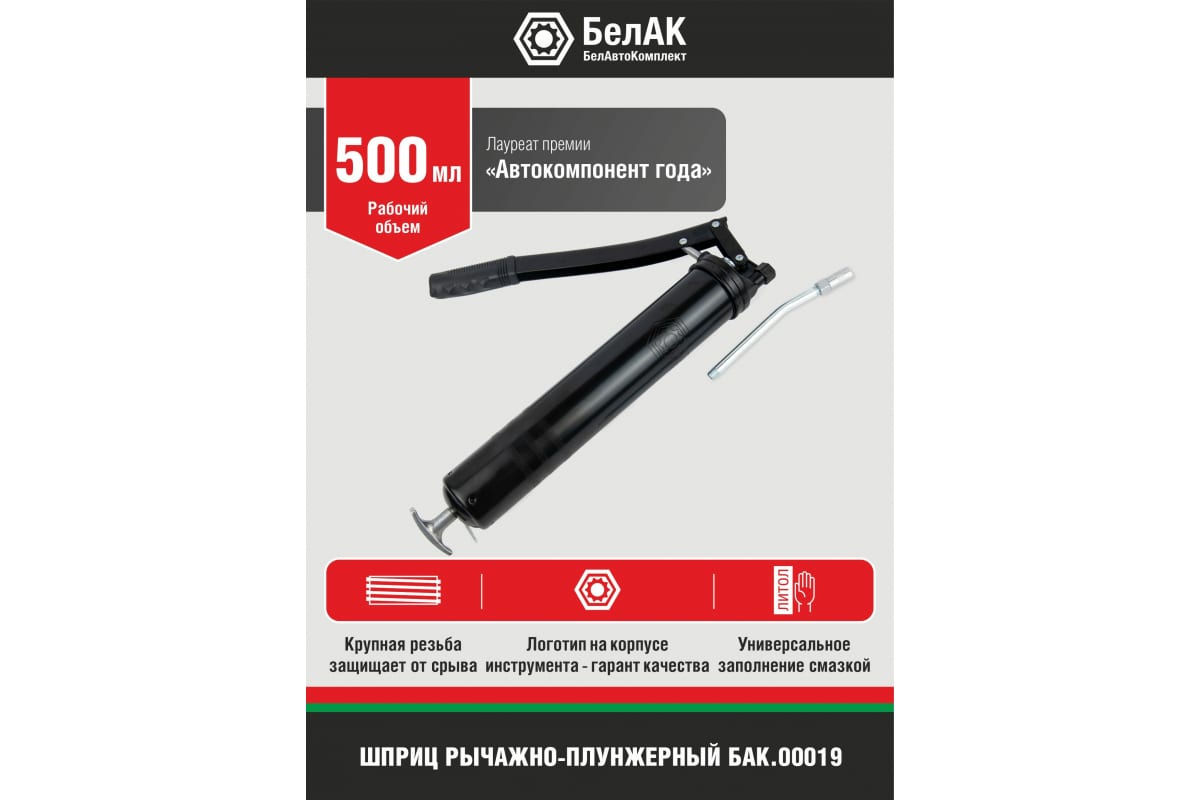 Рычажно-плунжерный шприц БелАК 500 мл БАК.00019 разработан российским производителем «БелАК», награждённым девятью национальными премиями «Автокомпонент года» и «Автоаксессуар года». Отдельная премия «Автокомпонент года» присуждена в номинации «Ручные нагнетатели смазки» за высокое качество и надежность выпускаемого инструмента для смазки узлов трения различных механизмов. Продукция «БелАК» соответствуют нормам сертификации ISO9001 и ЕАС. Шприцы защищены от подделки: на корпус каждого инструмента нанесен фирменный логотип «БелАК» методом трубной накатки.