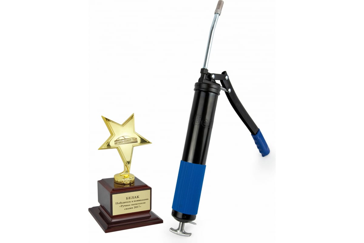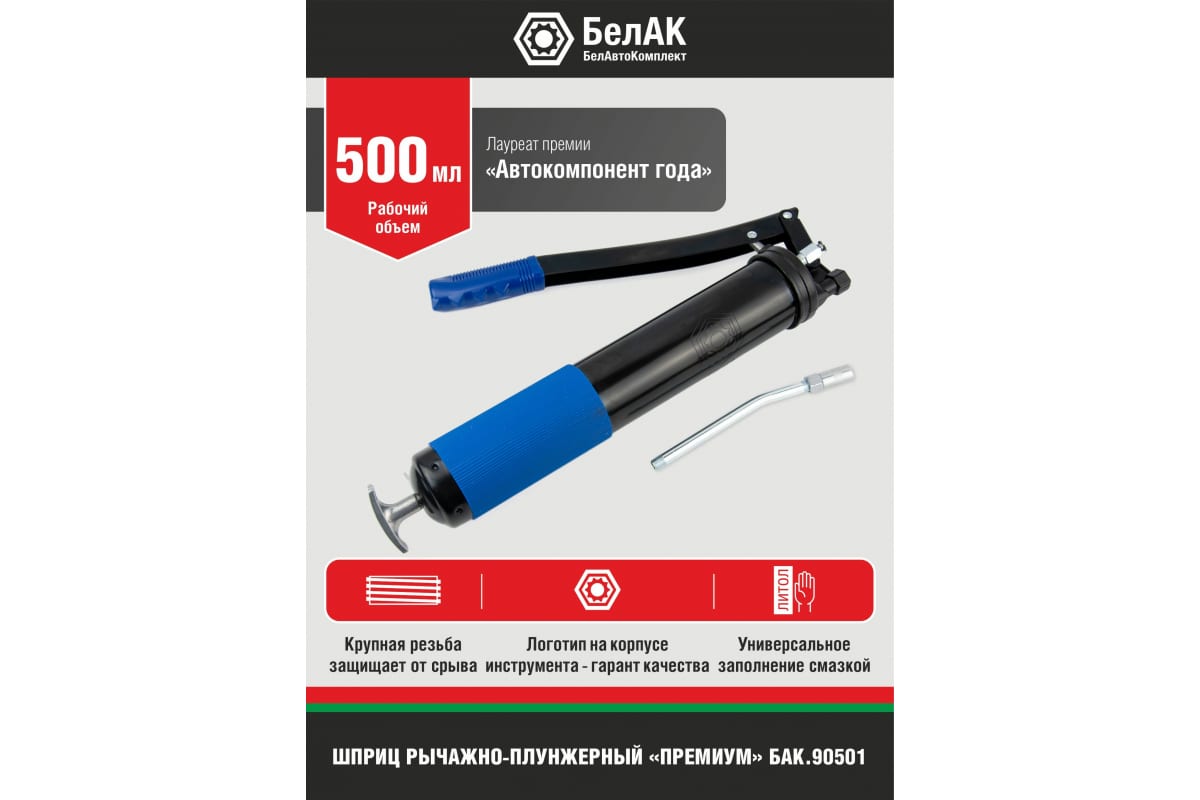 Рычажно-плунжерный шприц БелАК Премиум 500 мл БАК.90501 разработан российским производителем «БелАК», награждённым девятью национальными премиями «Автокомпонент года» и «Автоаксессуар года». Отдельная премия «Автокомпонент года» присуждена в номинации «Ручные нагнетатели смазки» за высокое качество и надежность выпускаемого инструмента для смазки узлов трения различных механизмов. Продукция «БелАК» соответствуют нормам сертификации ISO9001 и ЕАС. Шприцы защищены от подделки: на корпус каждого инструмента нанесен фирменный логотип «БелАК» методом трубной накатки.