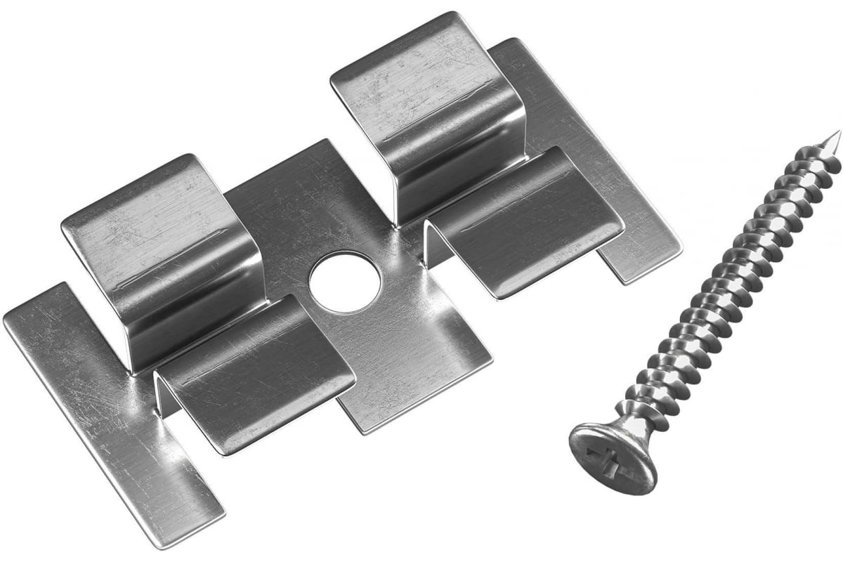 Рядная клипса из нерж. стали для монтажа доски ДПК с саморезом из нерж. стали Grinder deco TD 12 используется для крепления рядов террасных досок к лагам. На 1 м2 для террасной доски 125х25х3000 мм, с учетом шага крепления в 350 мм, требуется 24 шт. рядных клипс.