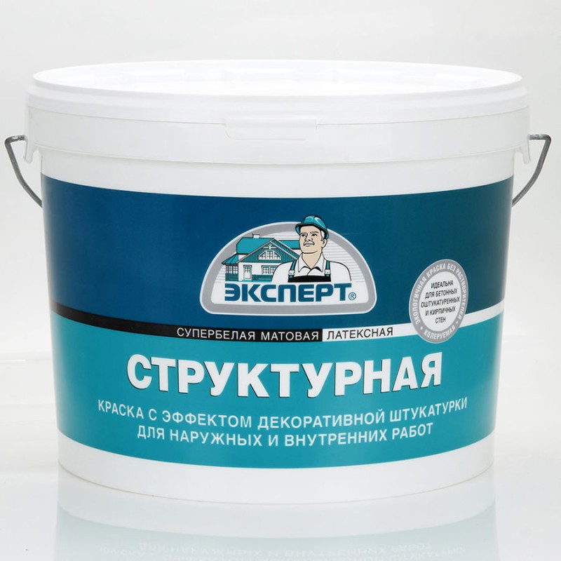Супербелая водоэмульсионная латексная краска с эффектом декоративной штукатурки для наружных и внутренних работ – ЭКСПЕРТ Структурная Супербелая матовая водоэмульсионная латексная краска с эффектом декоративной штукатурки для наружных и внутренних работ. Декоративная краска применяется для окраски фасадов и цоколей зданий, стен и элементов интерьера. Применяется в качестве краски по гипсокартону, краски по оштукатуренным и зашпатлеванным поверхностям, краски по бетону, краски по ДСП, ДВП и т. д. Структурная краска позволяет моделировать различные структуры поверхности, в зависимости от применяемого инструмента и техники нанесения. Латексная краска отличается высокой адгезией с окрашиваемой поверхностью.ОСОБЕННОСТИПозволяет моделировать различные структуры поверхностиВысокая степень белизны и укрывистости Высокая степень адгезии с окрашиваемой поверхностью Очень высокая экономичность примененияПОДГОТОВКА ПОВЕРХНОСТИРекомендуется предварительная обработка поверхности акриловой грунтовкой глубокого проникновения Эксперт или фасадной грунтовкой Эксперт ЭКСПЕРТ Структурная краска.РАСХОД1 кг на 1 кв.м. ЦВЕТБелый СТЕПЕНЬ БЛЕСКАСтруктурная ОСНОВА ДЛЯ НАНЕСЕНИЯБетон, Кирпич, Гипсокартон, Ранее окрашенные поверхности, ДСП, Штукатурка, Каменная кладка СРОК ГОДНОСТИ12 месяцев ФАСОВКА7кг, 14кг, 28кг