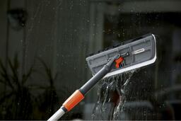 Щетка оснащена шарниром и поворачивается на 360°. Это обеспечивает особую гибкость и простоту в использовании в любой рабочей ситуации. Шарнир можно зафиксировать для легкого присоединения водосъемника. Водосъемник изготовлен из высококачественной, долговечной резиновой губки, что позволяет мыть окна без разводов.