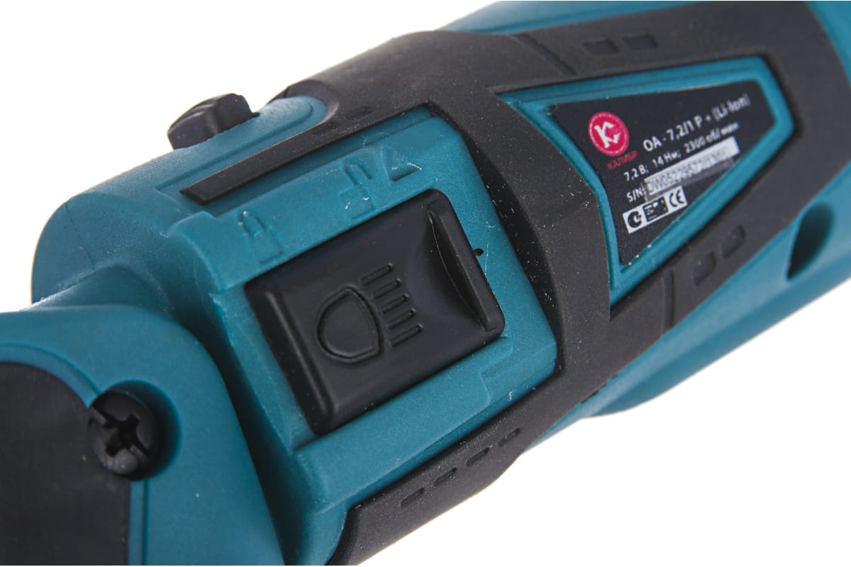 На корпусе а ккумуляторной отвёртки Калибр ОА-7,2/1 Р+ 00000045943 имеется специальный шарнир, с помощью которого можно менять форму инструмента в зависимости от желания оператора.