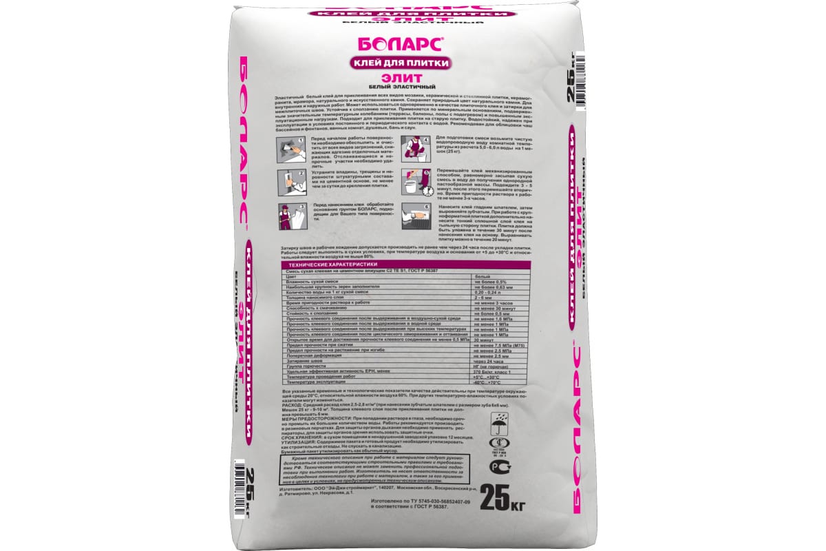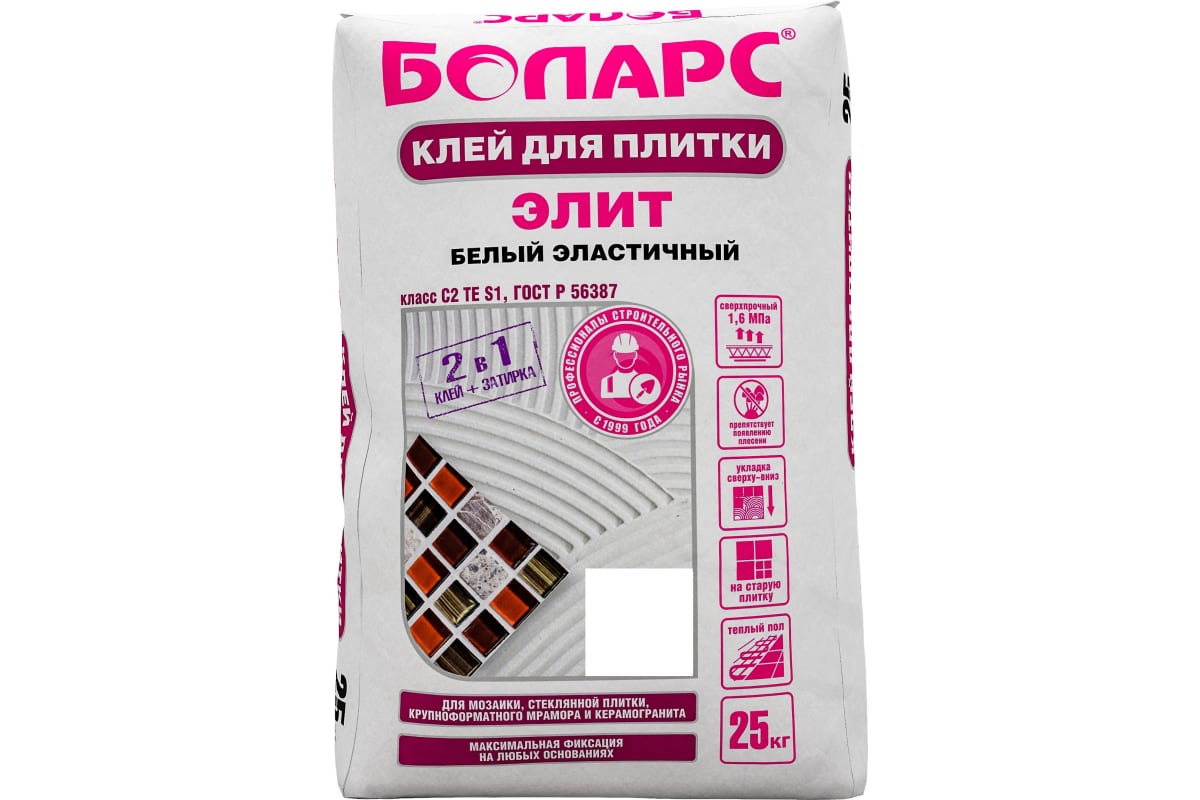 Клей для плитки БОЛАРС ЭЛИТ 25 кг 00000003749 - высокоэластичный высокопрочный белый клей для приклеивания всех видов мозаики, керамической и стеклянной плитки, мрамора, керамогранита, натурального и искусственного камня.