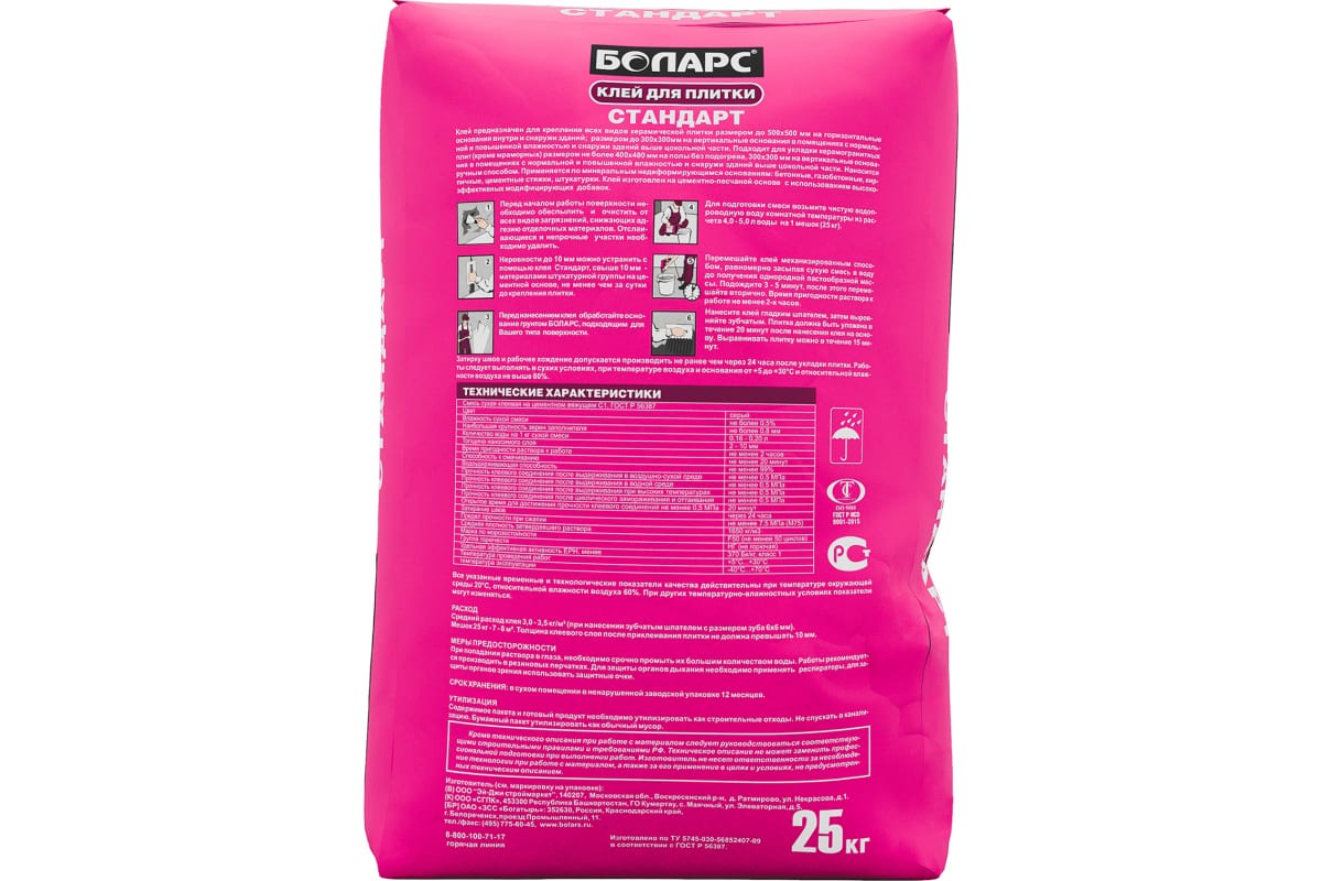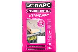 Клей для плитки БОЛАРС Стандарт 25 кг 00000003743 - усиленный клей класса С1 для укладки любых видов керамических, клинкерных, плит из природного и искусственного камня и керамогранита малого и среднего формата на вертикальные поверхности до 450х450 мм, на горизонтальные поверхности до 600х600 мм.