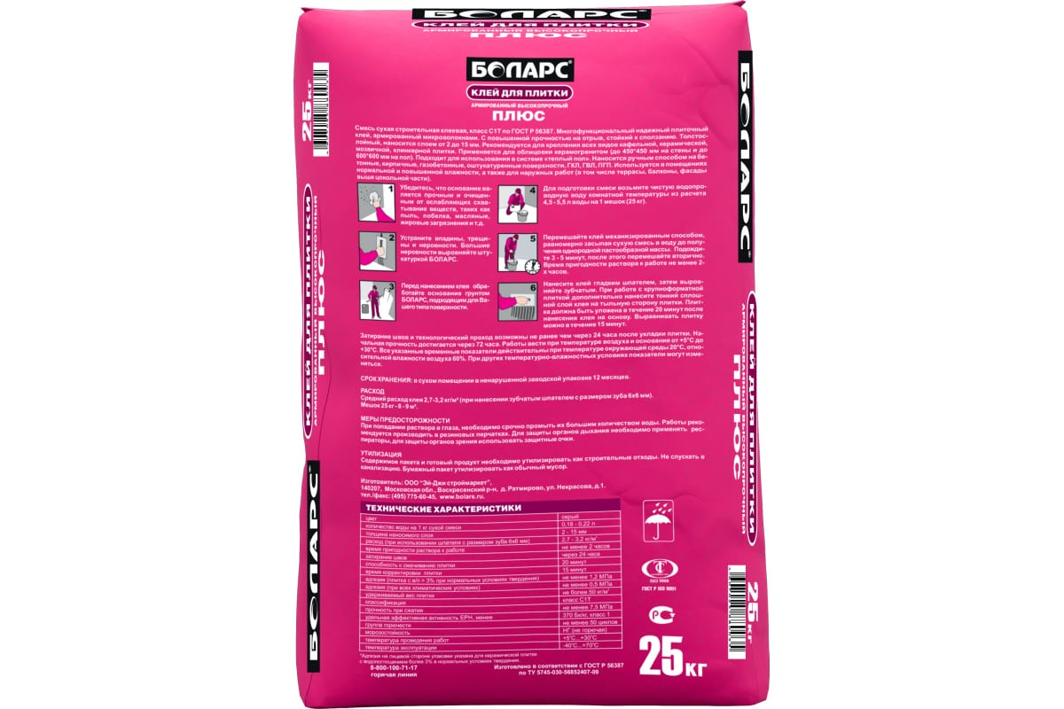 Клей для плитки БОЛАРС Плюс 25 кг 00000003740 - многофункциональный надежный плиточный клей, армированный микроволокнами. С повышенной прочностью на отрыв, стойкий к сползанию. Толстослойный, наносится слоем от 2 до 15 мм. Рекомендуется для крепления всех видов кафельной, керамической, мозаичной, клинкерной плитки. Применяется для облицовки керамогранитом (до 450х450 мм на стены и до 600х600 мм на пол). Подходит для использования в системе "теплый пол". Используется в помещениях с нормальной и повышенной влажностью, а также для наружных работ (в том числе, для облицовки террас, балконов, фасадов выше цокольной части).