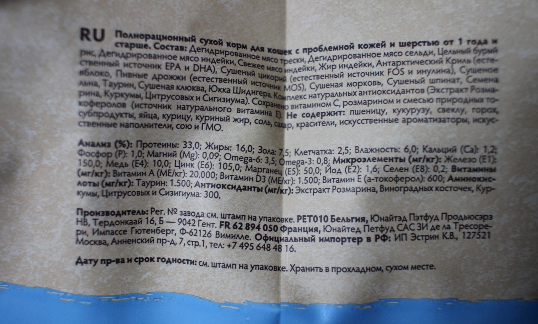 Ингредиентыдегидр. и свежее мясо трески, сельди и индейки, картофель, жир / витамины, минералы /