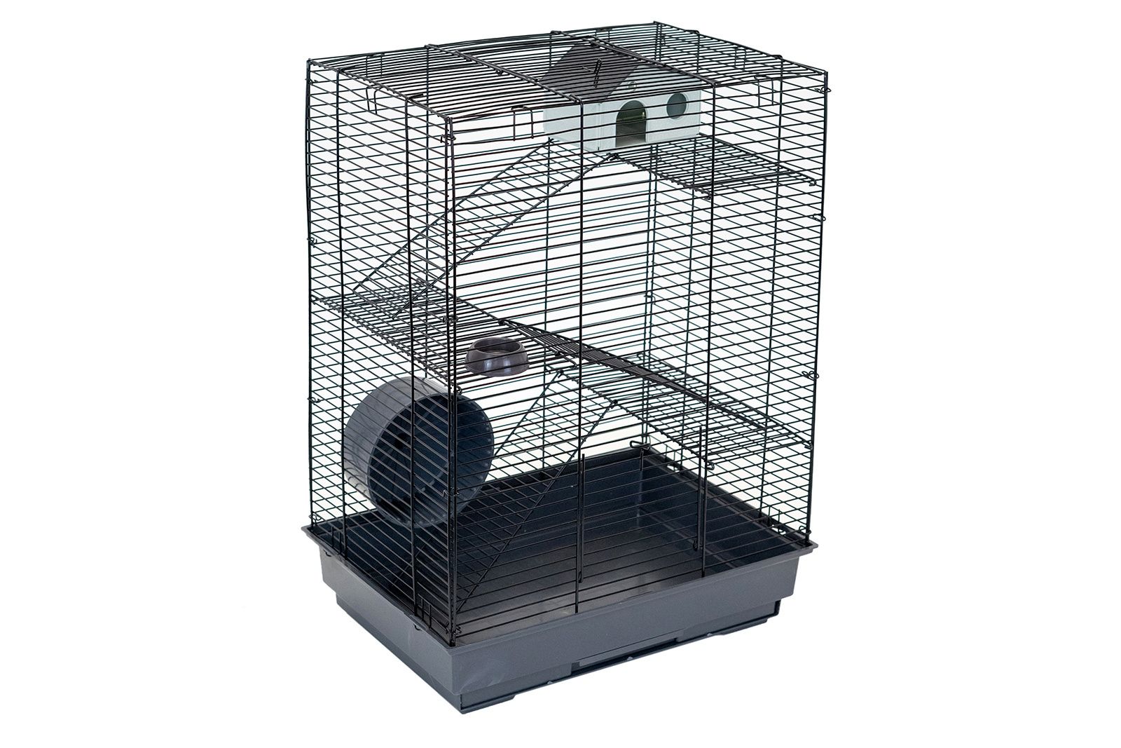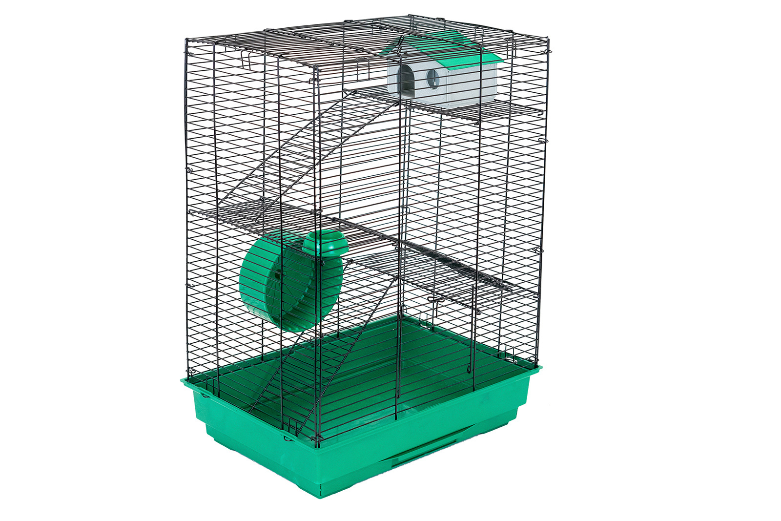 Клетка для грызунов металлическая на пластиковом поддоне с вынимающейся вставкой. Разборная конструкция - 4 стенки и крыша. Имеются две дверцы - в передней (длинной) стенке и крыше. В комплекте: 3 металлических этажа, домик, колесо диаметром 140мм, миска диаметром 60мм.