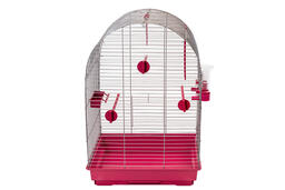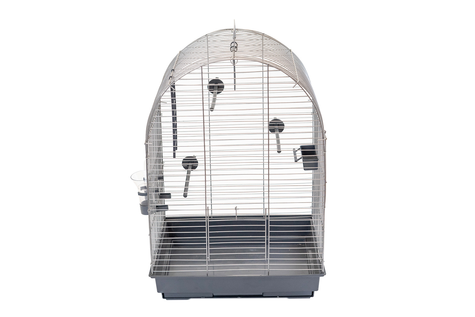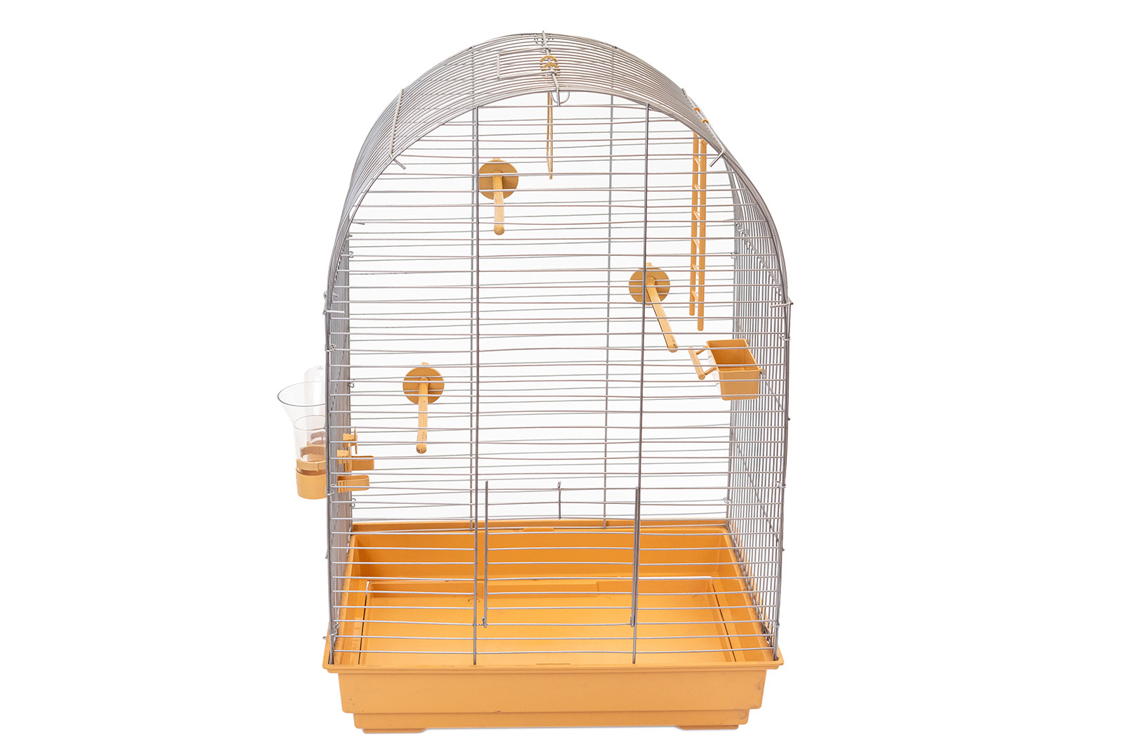 Клетка для птиц металлическая на пластиковом поддоне с вынимающейся вставкой. Клетка имеет полукруглую форму. Конструкция разборная - 4 стенки и крыша. Дверца - в передней (длинной) стенке. Передняя и задняя стенка имеют горизонтальные прутья (расстояние между прутьями 12,5мм) для возможности лазания по стенке. Боковые стенки имеют вертикальные прутья (расстояние между прутьями 12,5мм). В комплекте: 3 пластиковых жердочки (диаметр 1см) с креплениями к прутьям, пластиковая кормушка с жёрдочкой с креплением за прутья, пластиковая поилка с прозрачной колбой с креплением за прутья и схожая с ней по конструкции вертикальная кормушка для сыпучего корма (прозрачная колба с воронкой сверху), качель для птиц с креплением к крыше клетки в виде двух колец, лесенка длиной 20см с разноосным креплением.