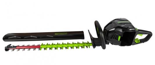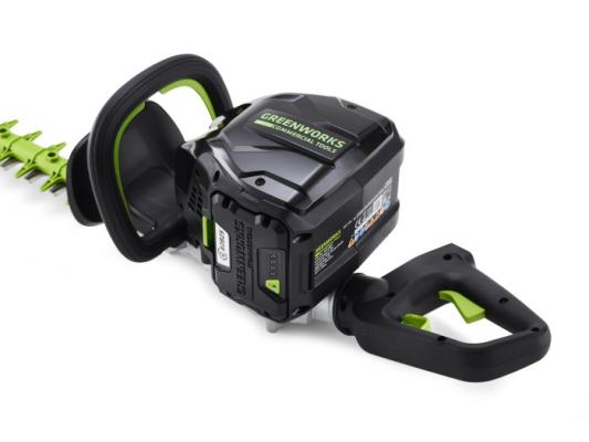 - Прочие особенности и свойства Кусторез аккумуляторный Greenworks из линейки устройств 82V Commercial (модель GD82HT) - это мощная профессиональная модель кустореза, специально предназначенная для коммерческого использования. Её основное предназначение: подрезка кустарника, живой изгороди и деревьев. Тип двигателя, применяемого в данной модели - индукционный или бесщеточный (DigiPro). Такой двигатель сопоставим по мощности с двигателями внутреннего сгорания (на 2,5-3 л/с) и при этом он обладает всеми плюсами электро двигателя: повышенный крутящий момент, экологичность, низкий уровень шума и вибрации, легкий вес. Для удобства работы рукоятка кустореза может поворачиваться на 180°. Лезвие с алмазной заточкой имеет длину 61 см. и шаг среза 33 мм., что позволяет справиться даже с толстыми ветвями деревьев. В случае застревания веток в лезвии, предусмотрен обратный ход. Долгое автономное время работы (до 80 минут от 5 А/ч батареи) и отсутствие необходимости использовать бензин и масло, протягивать за собой провод по участку - вот ключевые преимущества аккумуляторной техники. Эта модель оснащена предохранителем от случайного включения и защитным щитком от пореза рук (как на электро пилах). Для долговечной работы двигатель имеет защиту от перегрузки.