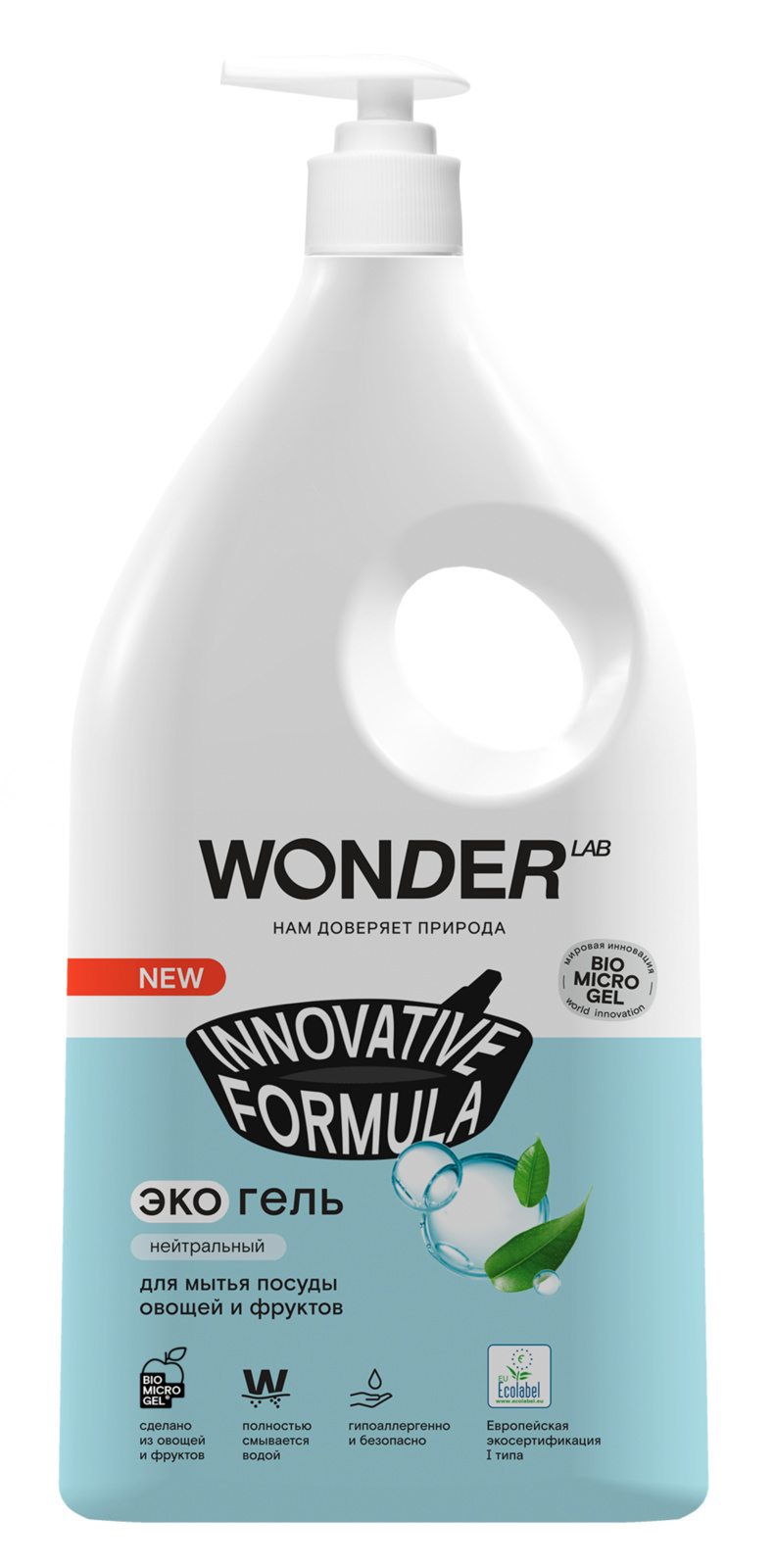 Экосредства WONDER LAB созданы на основе инновационного компонента Biomicrogel®, который сделан из овощей и фруктов. Средства WONDER LAB не вредят окружающей среде, не содержат опасных компонентов и разлагаются на 98% за 1 день. Гель для посуды WONDER LAB подходит для септиков.