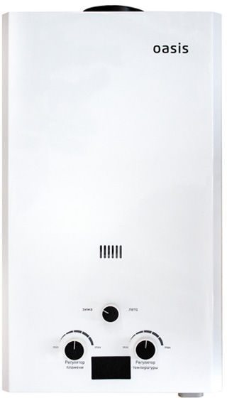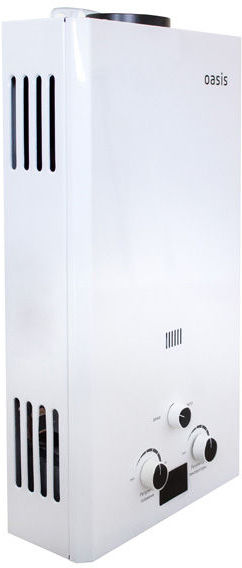 Водонагреватель проточный, газовый нагрев, производительность 13 л/мин, вертикальная установка, подводка нижняя, защита от перегрева.