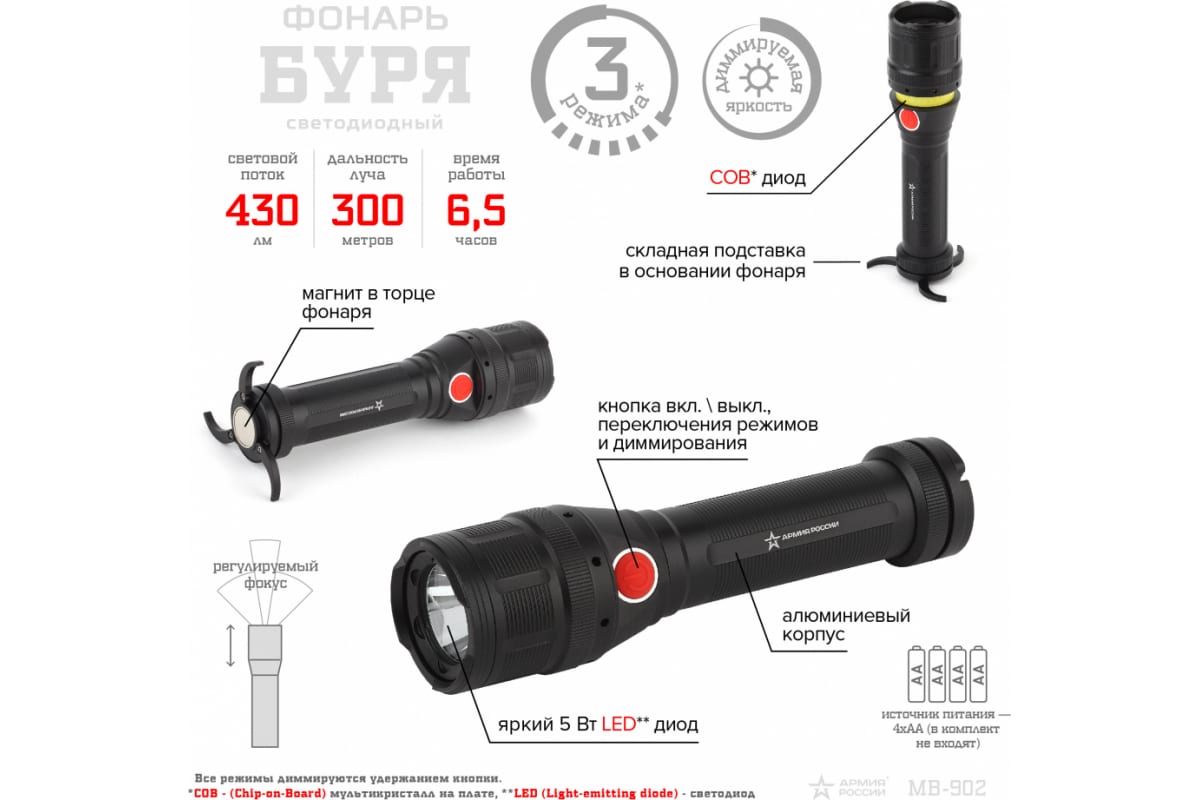 Фонарь ЭРА Буря MB-902 5Вт LED+COB светильник, алюминий, регулируемый фокус, диммер, 4xAA, Б0036612 - современный, функциональный и эргономичный. В качестве источников света используются светодиод SMD и светодиодная матрица COB.