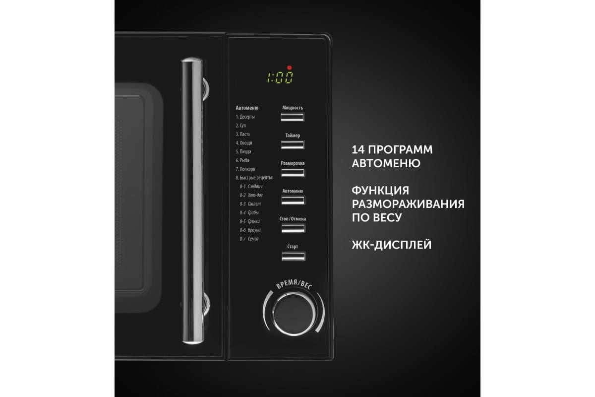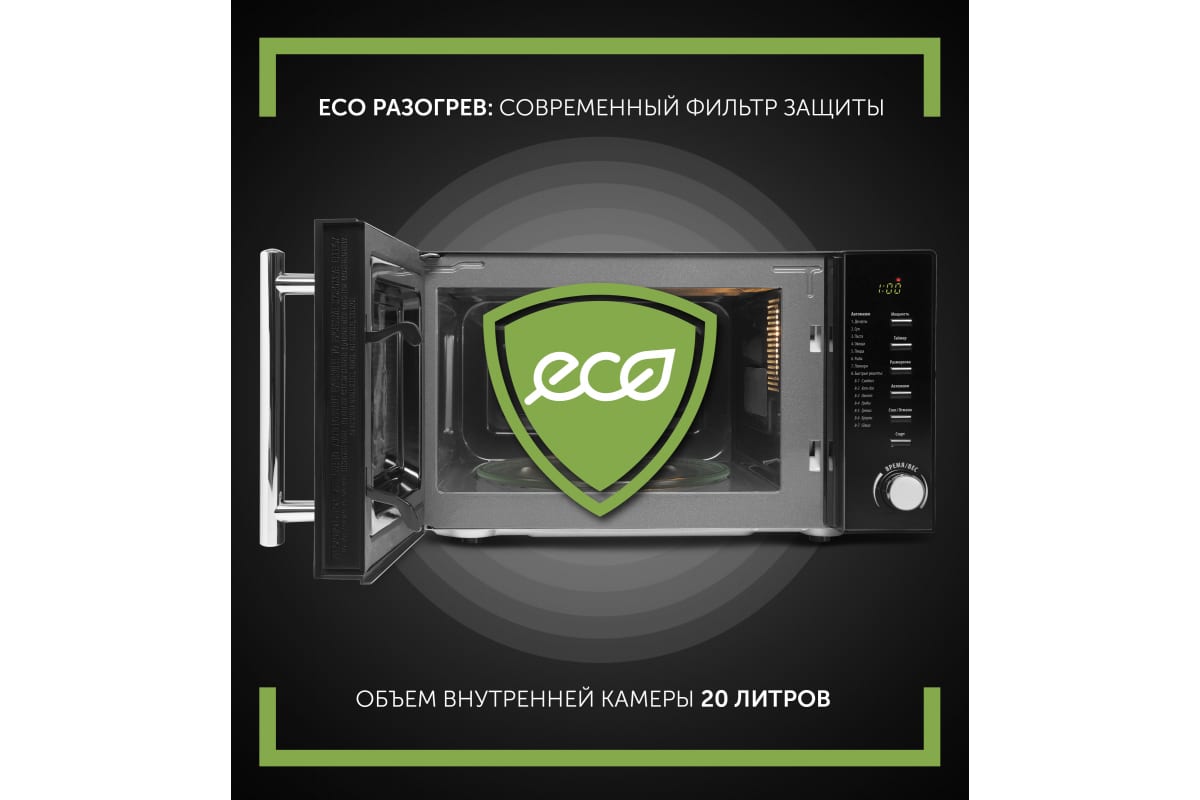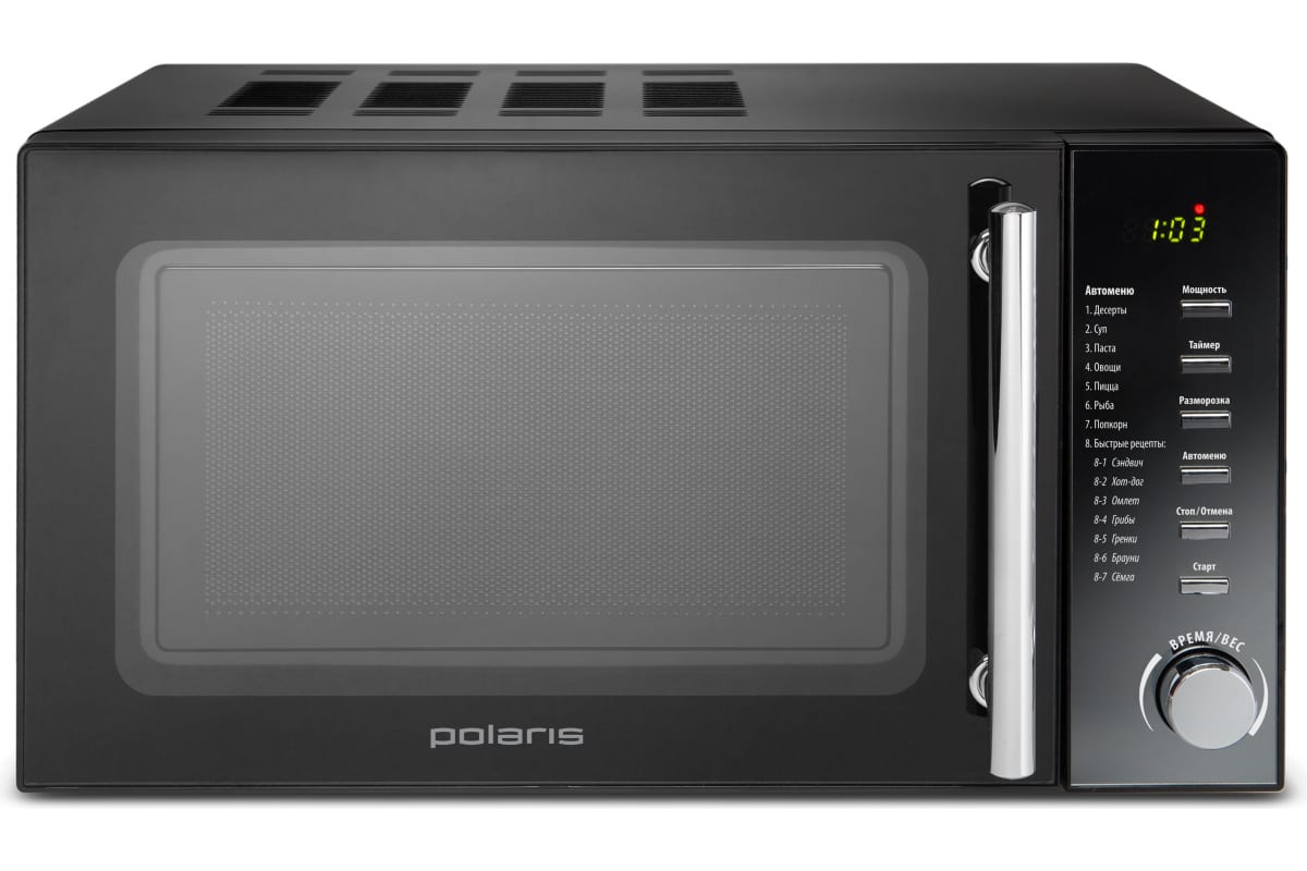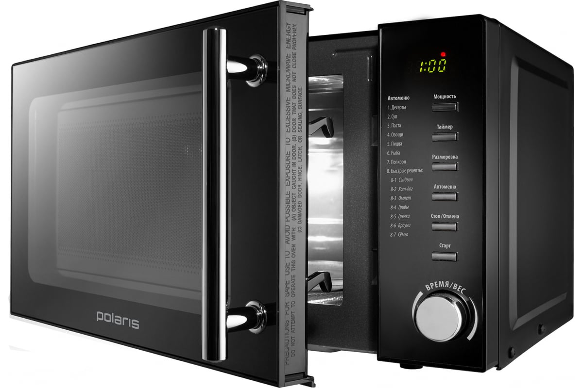 Микроволновая печь Polaris PMO 2002D RUS, соло, 20 л 015473 предназначена для приготовления и разогрева пищи.3D TurboHeat: система равномерного распределения микроволн и приготовления с 3-х сторон.ECO разогрев: современный фильтр защиты.PRO-3 EASY CARE: инновационное покрытие легкой очистки.Эффективная защита магнетрона.14 программ автоменю.Функция размораживания по весу.Объем внутренней камеры: 20 л.10 лет гарантии на покрытие от коррозии.Рабочая мощность - 700 Вт.Номинальная потребляемая мощность - 1200 Вт.Вращающееся стеклянное блюдо, d 245 мм.Подсветка во время работы.ЖК-дисплей.Блокировка от детей.