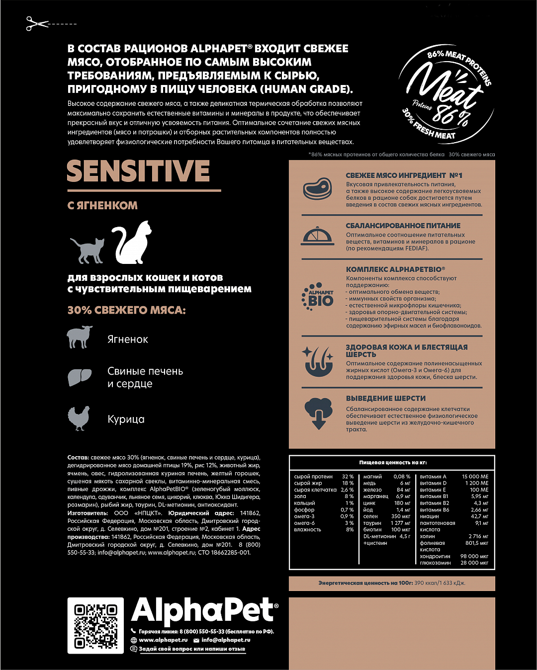 Ингредиенты: Свежее мясо 30% (ягненок, свиные печень и сердце, курица), дегидрированное мясо домашней птицы 19%, рис 12%, животный жир, ячмень, овес, гидролизованная куриная печень, желтый горошек, сушеная мякоть сахарной свеклы, витаминно-минеральная смесь, пивные дрожжи, комплекс AlphaPetBIO® (зеленогубый моллюск, календула, одуванчик, льняное семя, цикорий, клюква, Юкка Шидигера, розмарин), рыбий жир, таурин, DL-метионин, антиоксидант.