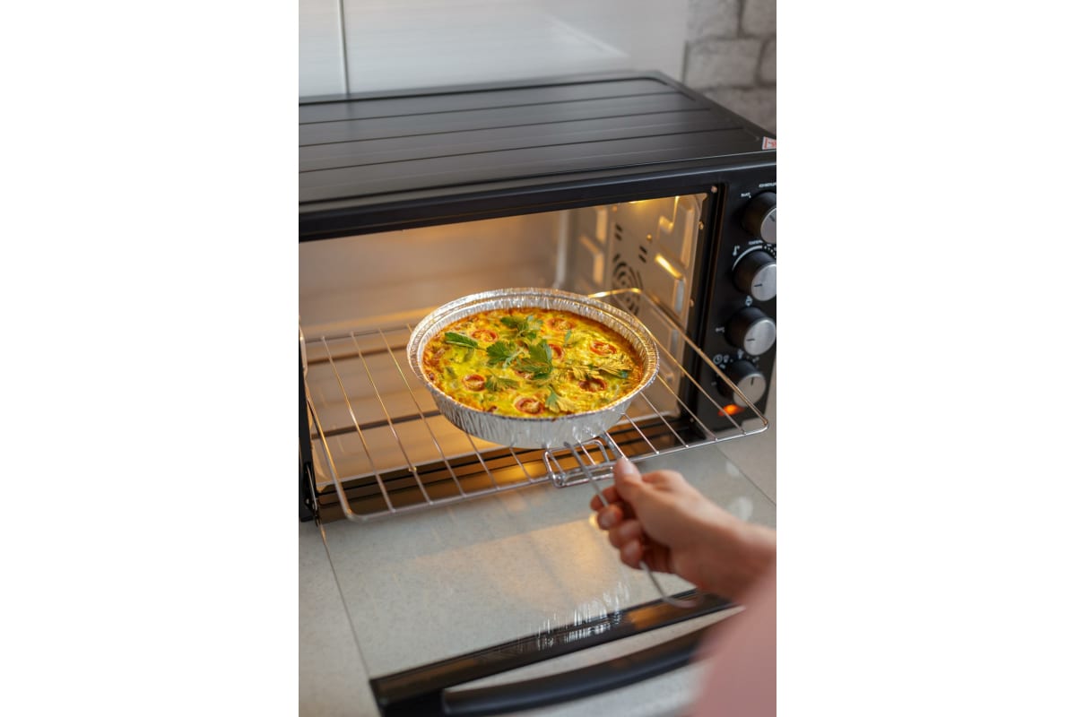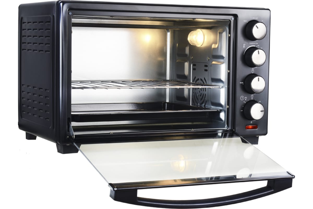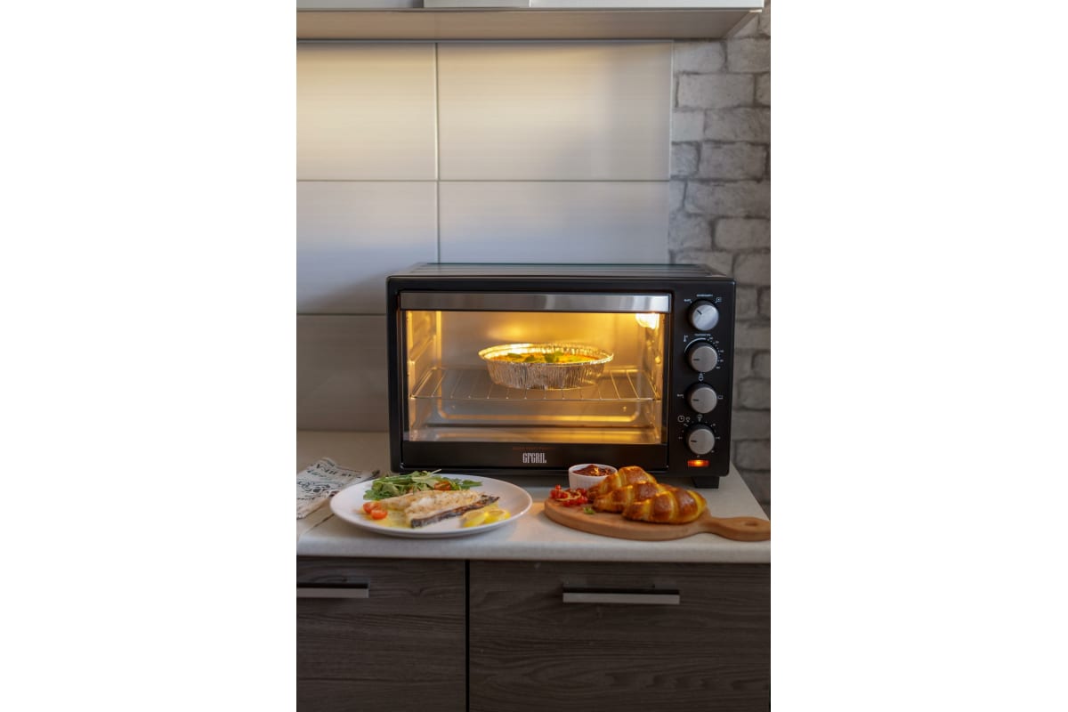 Мини-печь GFGRIL Convection Plus GFO-30B выполнена из нержавеющего металла в черном лаконичном дизайне. Высокая мощность 1600 Вт. Благодаря компактным размерам её легко как разместить на столе или шкафу в кухне, так и брать с собой на дачу или поездку. Внутренний объём 30 литров позволяет приготовить большие куски мяса, пироги, рыбу на всю семью. Толстое закаленное стекло надежно защищает от жара и позволяет наблюдать за процессом приготовления. Внутри камеры расположен вентилятор для конвекции и лампочка для подсветки. Предусмотрено несколько режимов приготовления: конвекция, когда горячий воздух равномерно непрерывно циркулирует по камере, режим используется для прожарки и выпечки, а также вариации поочерёдного и одновременного включения верхнего и нижнего нагревательных элементов для приготовления продуктов с эффектом гриля. Установить любой режим можно с помощью удобных механических регуляторов. Температура регулируется от 100° до 250° С, время приготовления и таймер отключения можно установить от 5 до 60 минут. Таймер и внутренняя подсветка печи работают одновременно. После включения загорается индикатор включения. О завершении процесса приготовления оповестит звуковой сигнал. Мини-печь поставляется с противнем, металлической решеткой и зажимом для безопасного и лёгкого вынимания. Прорезиненные ножки способствуют устойчивости мини-печи на скользких поверхностях.