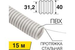Гофрированная труба из ПВХ REXANT с зондом d 40 мм серая 15 м 28-0400-2 применяется при монтаже электрических, компьютерных, телефонных и телевизионных сетей напряжением не выше 1000 В. Выполнена из самозатухающей композиция ПВХ с наличием металлического зонда (протяжки) по всей длине трубы, который облегчает протяжку кабеля после монтажа.