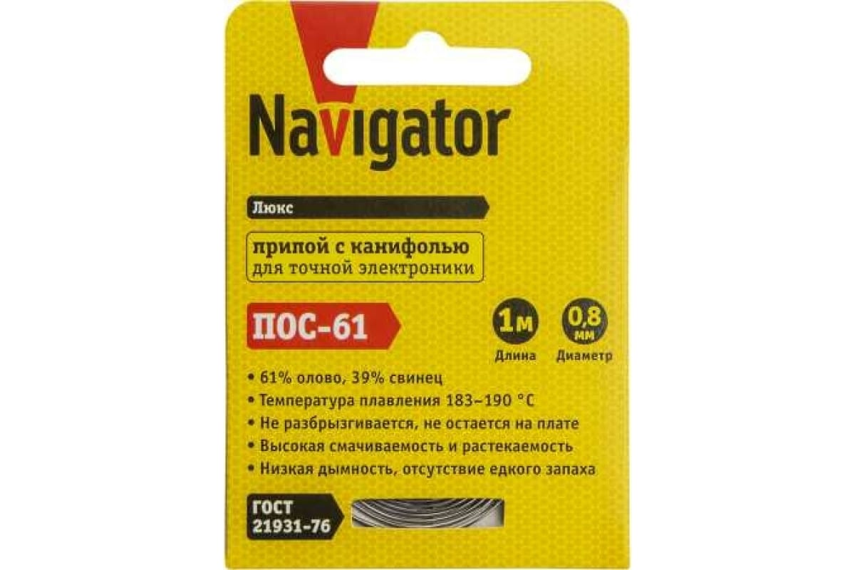 Припой NEM-Pos03-61K-0.8-S1 ПОС-61 (1 м; 0.8 мм; спираль) Navigator 93088 предназначен для пайки и лужения радио- и электроаппаратуры, печатных схем, где недопустим перегрев. Содержание канифоли в припое делает паянное соединение герметичным и механически прочным. Обладает высокой устойчивостью на изгиб. Содержит 2% флюса.