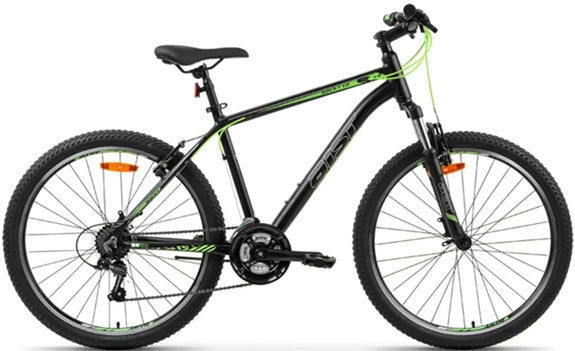 Горный, с амортизационной вилкой, материал рамы - сплав алюминия, колеса - 26 , трансмиссия 21 скор, Тормоза: передний - ободной, задний - ободной, вес 14 кг.