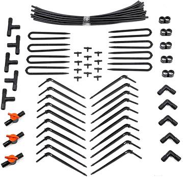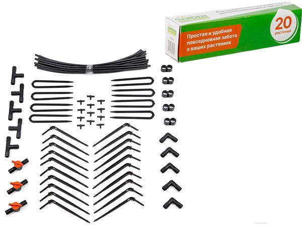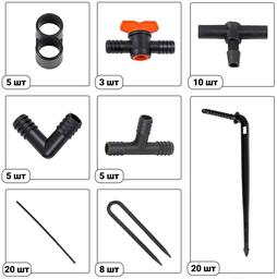 - В комплекте шланг (подающий 40см х 20шт.), соединительный элемент (тройник, 15 шт.; уголок, 5 шт.; зажим, 5 шт.; прижим, 8 шт.), стрелка (20 шт.), кран (3 шт.)